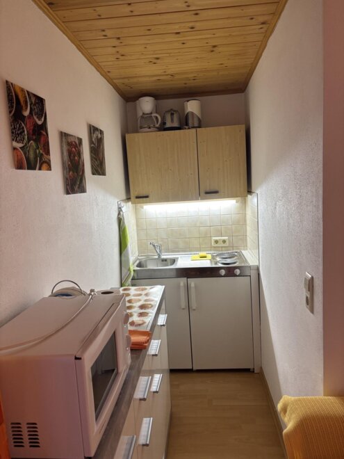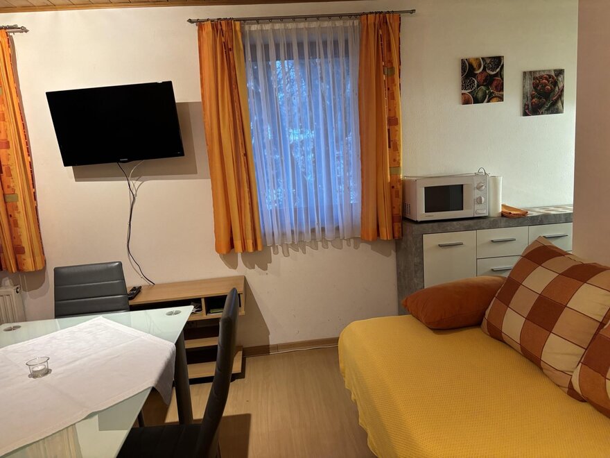2-room apartment for 2 to 3 people, consisting of a living-bedroom with double bed and sofa bed, satellite TV, a small fully equipped kitchen (electric stove, refrigerator, microwave, toaster, coffee machine, kettle,....) with dining area, shower/WC