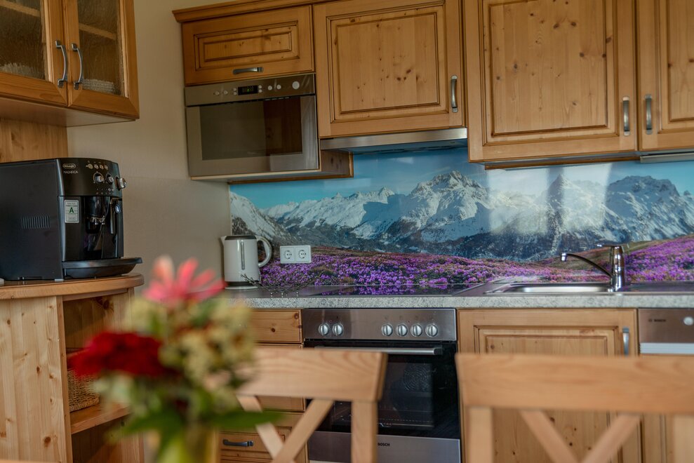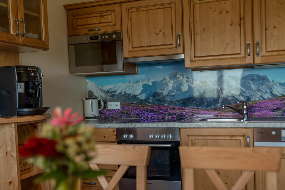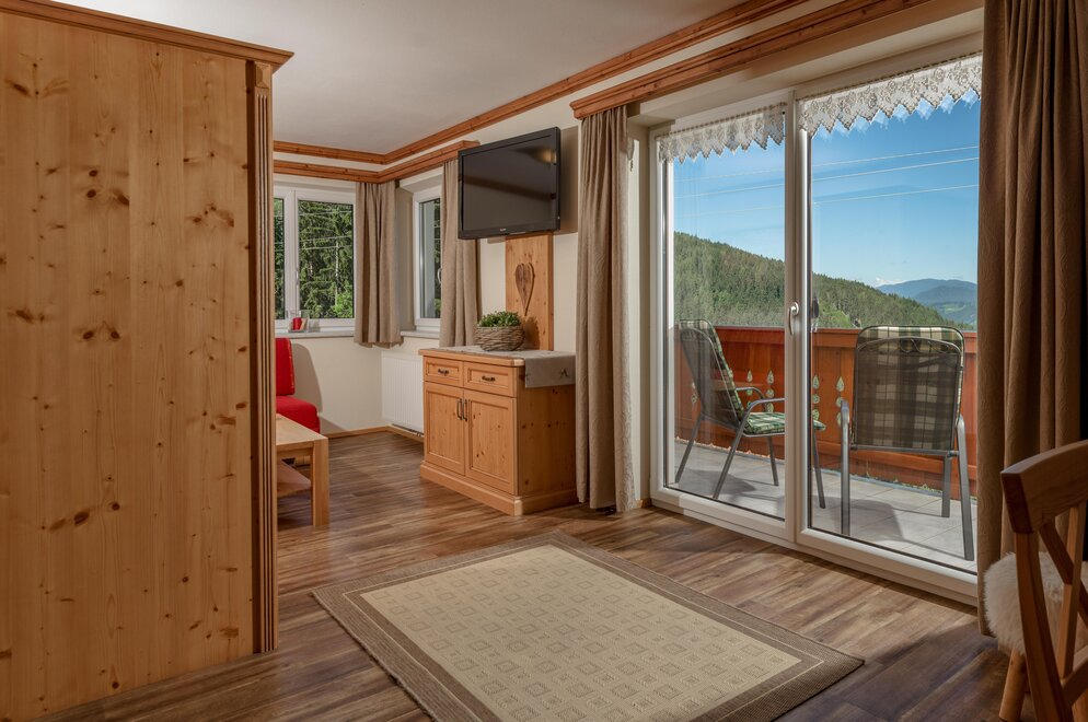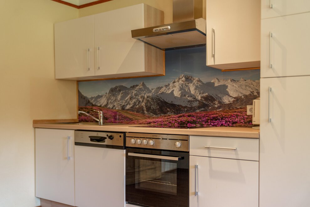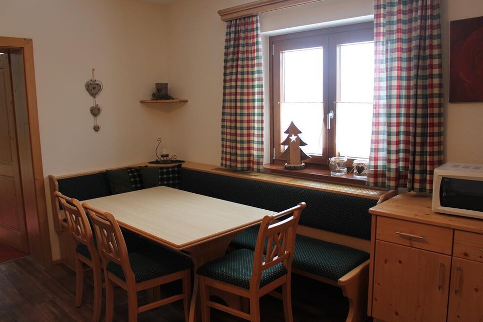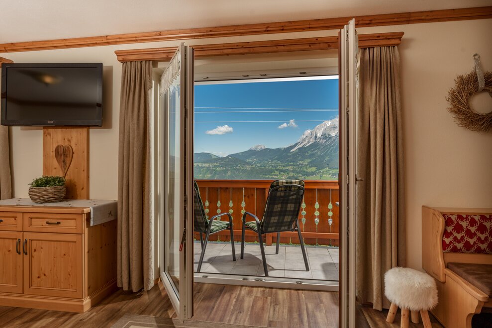 Surrounded by meadows and forests in a quiet, sunny location at 1.100 m above sea level, you will live in our 5 newly built non-smoking apartments. We offer different types of apartments for 2 to 7 persons. Depending on the size of the apartment, one to 2 separate bedrooms are at your disposal. Each apartment has a living/bedroom, a fully equipped kitchen and a bathroom with shower and toilet. Sat-TV and free W-Lan are of course available in the house Taxegger. But what you will enjoy most is the fascinating view of the Dachstein massif from the balcony of the apartments.