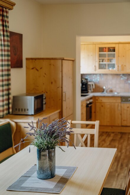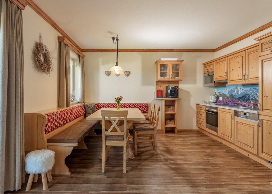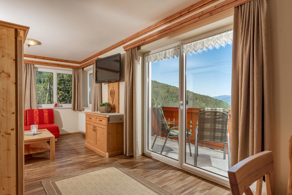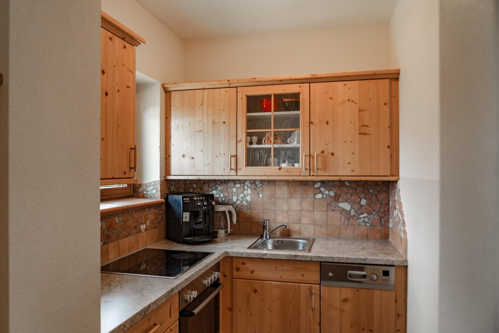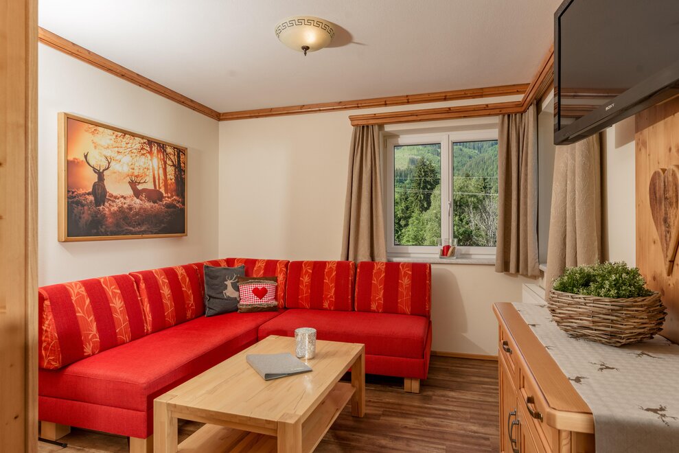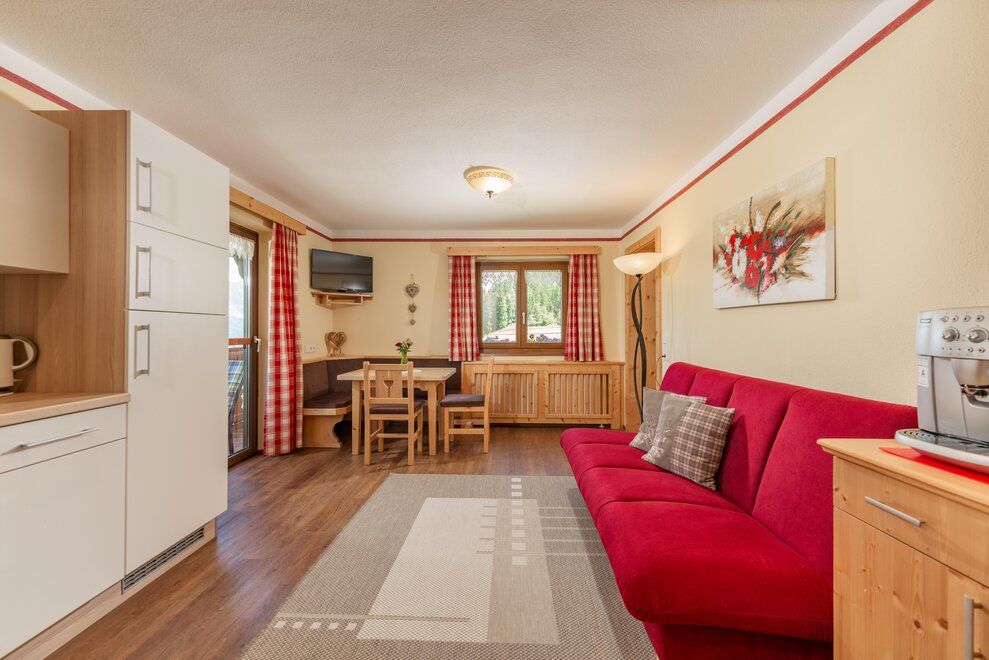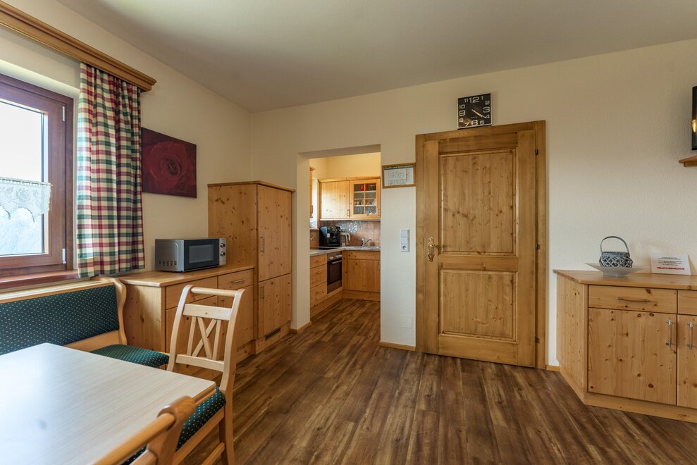 Surrounded by meadows and forests in a quiet, sunny location at 1.100 m above sea level, you will live in our 5 newly built non-smoking apartments. We offer different types of apartments for 2 to 7 persons. Depending on the size of the apartment, one to 2 separate bedrooms are at your disposal. Each apartment has a living/bedroom, a fully equipped kitchen and a bathroom with shower and toilet. Sat-TV and free W-Lan are of course available in the house Taxegger. But what you will enjoy most is the fascinating view of the Dachstein massif from the balcony of the apartments.