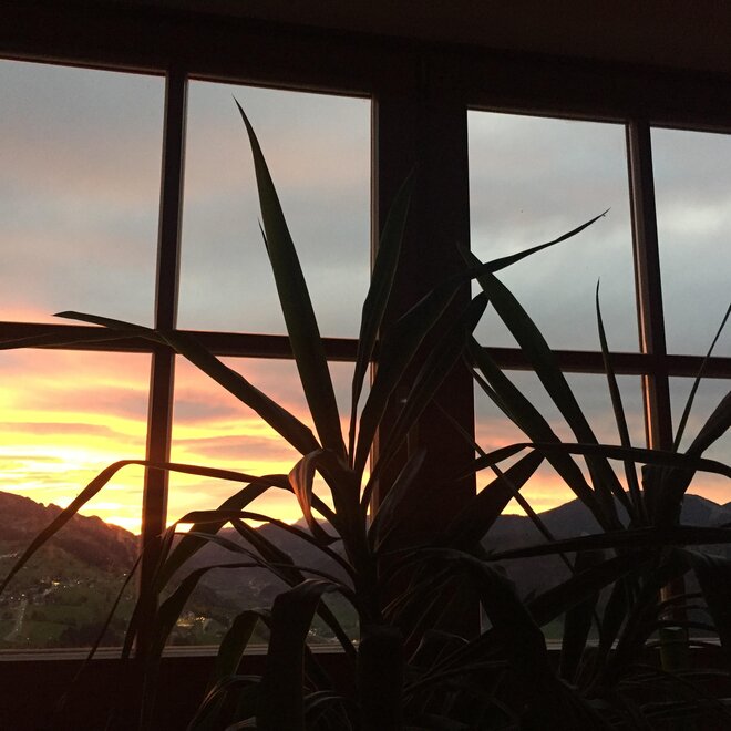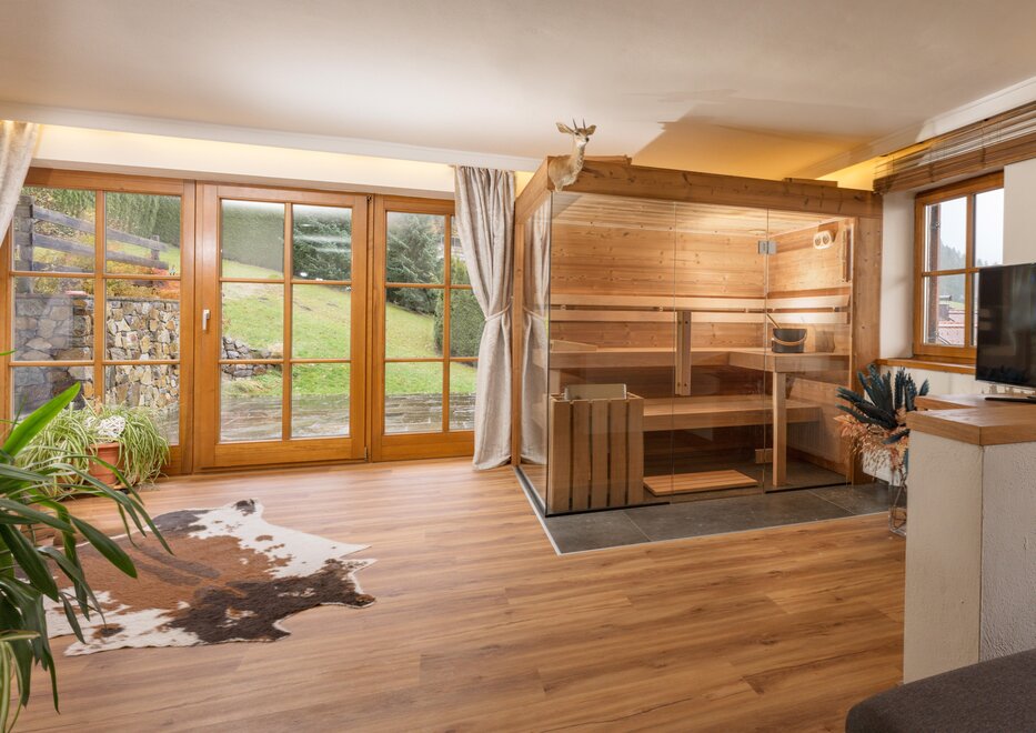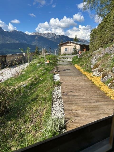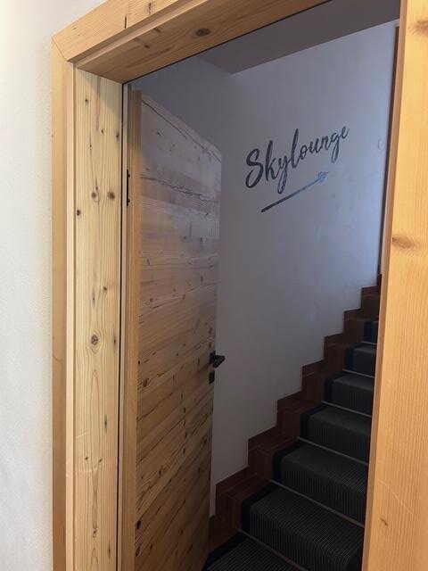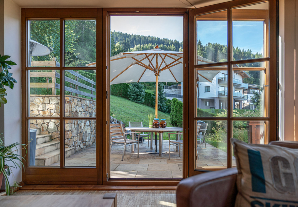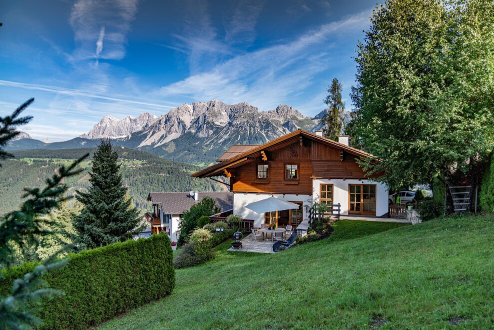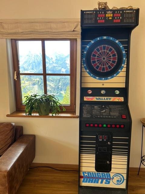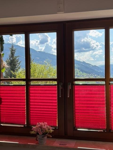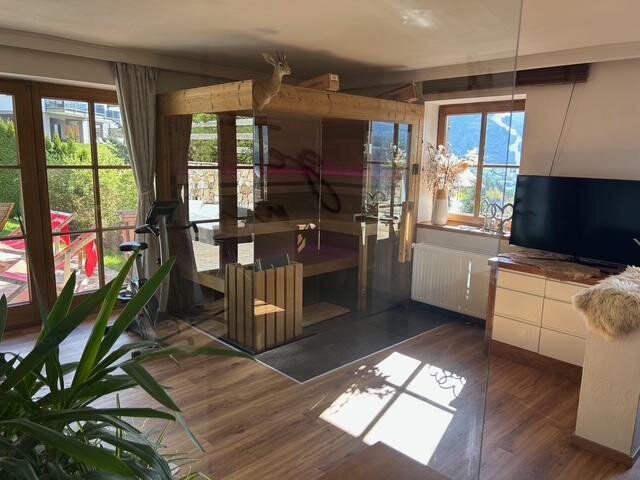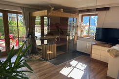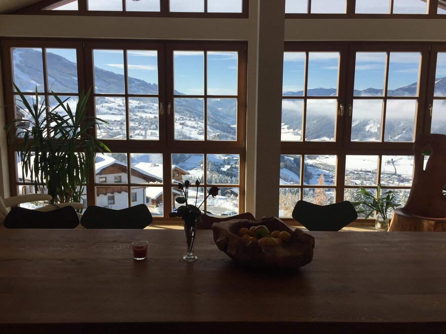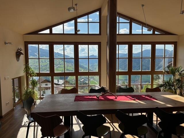 1 large living room with dining table, refrigerator, and unique view over Schladming!
