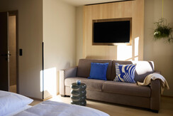 The hotel features 19 stylish rooms and suites for 2-6 guests, offering amenities such as box spring beds, lounge chairs, high-speed Wi-Fi, smart TVs with Netflix, and a homemade breakfast buffet prepared by a dedicated team. Enjoy a relaxed "Feel-Free" service with self check-in and check-out at the hotel terminal, 24/7 snacks from "Berta"—the automatic drink-and-snack dispenser—and access to an on-site bike room as well as an external ski depot right at the "Planai West" gondola station.