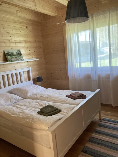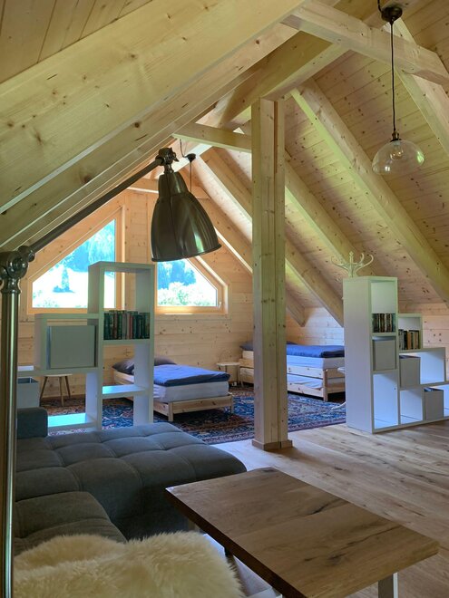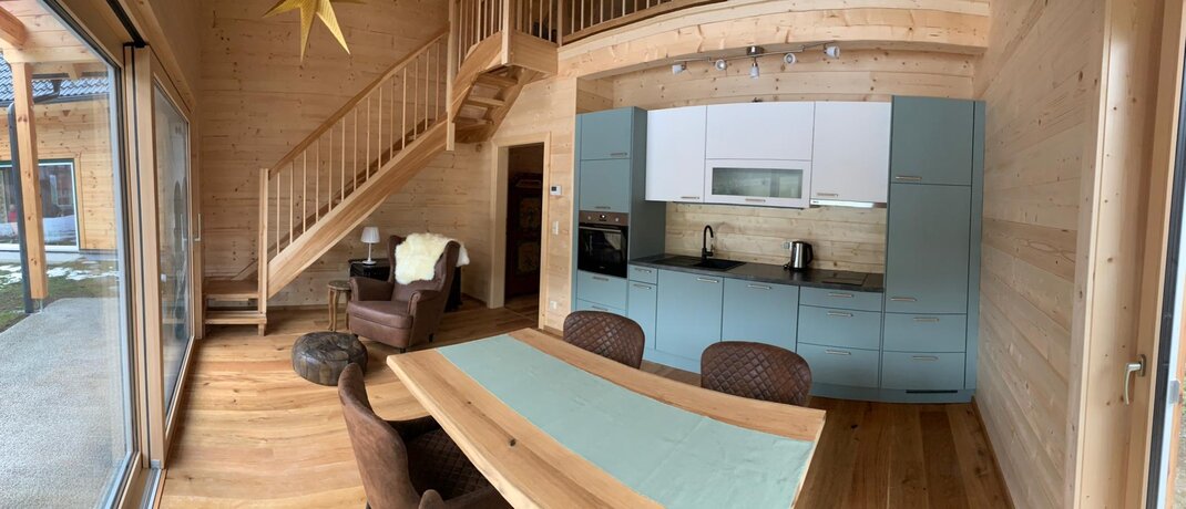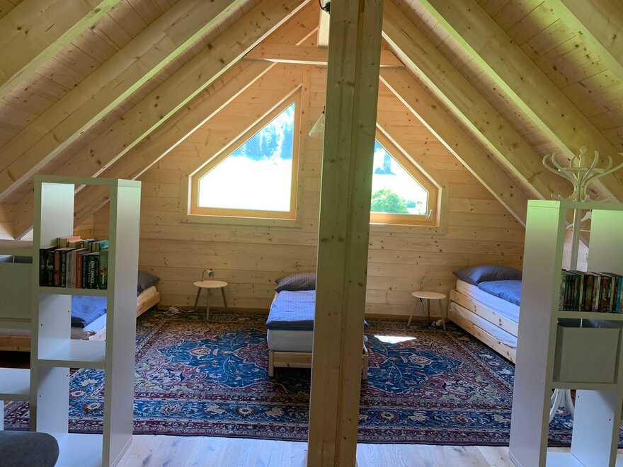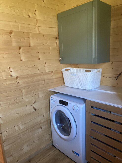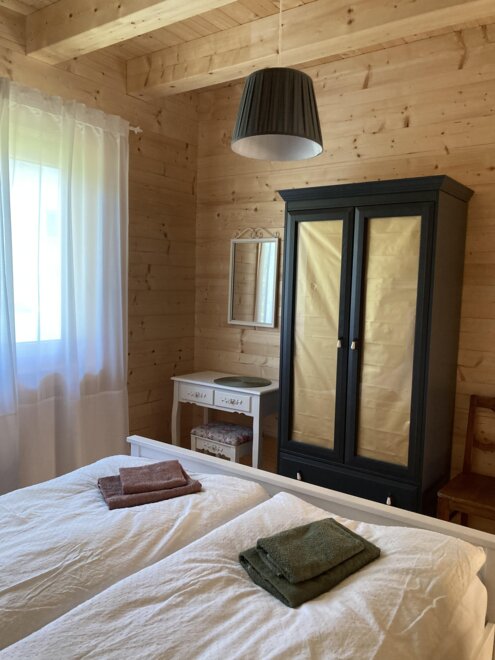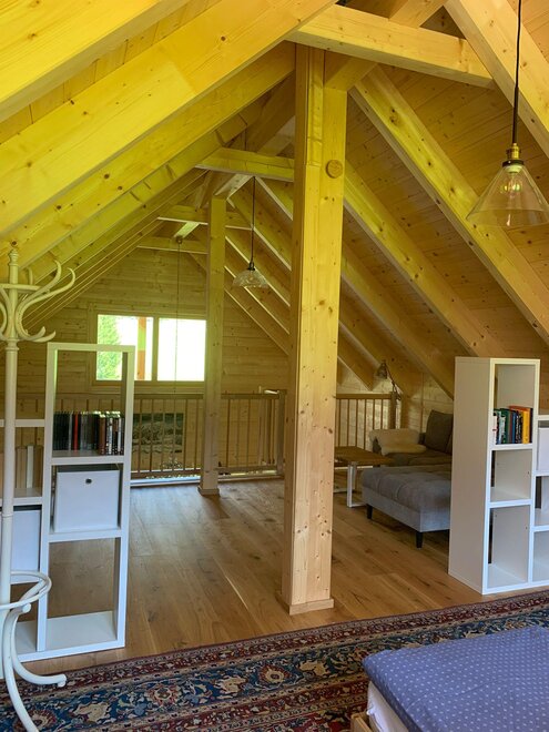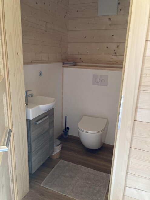 The wooden house consists on the ground floor of an entrance hall, from which a shower, a bedroom for 2 people, a toilet, a storage room with washing machine, and a fully equipped kitchen-living room lead off. From the kitchen-living room, which is open to the top and equipped with a visible roof structure, a narrow staircase leads to the spacious upper floor with 2-4 beds, a sofa, and a TV with a DVD player.