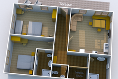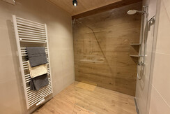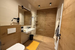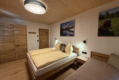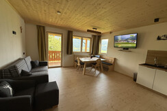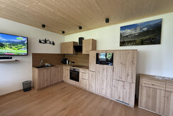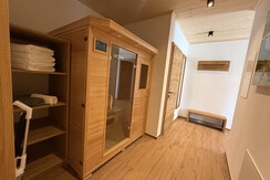 Flat Fichte: This flat is lovingly furnished with spruce wood and has a fully equipped kitchen with a cosy sitting area; two separate bedrooms, each with its own bathroom; an additional separate WC; barrier-free access, a balcony with breathtaking views and its own infrared sauna.