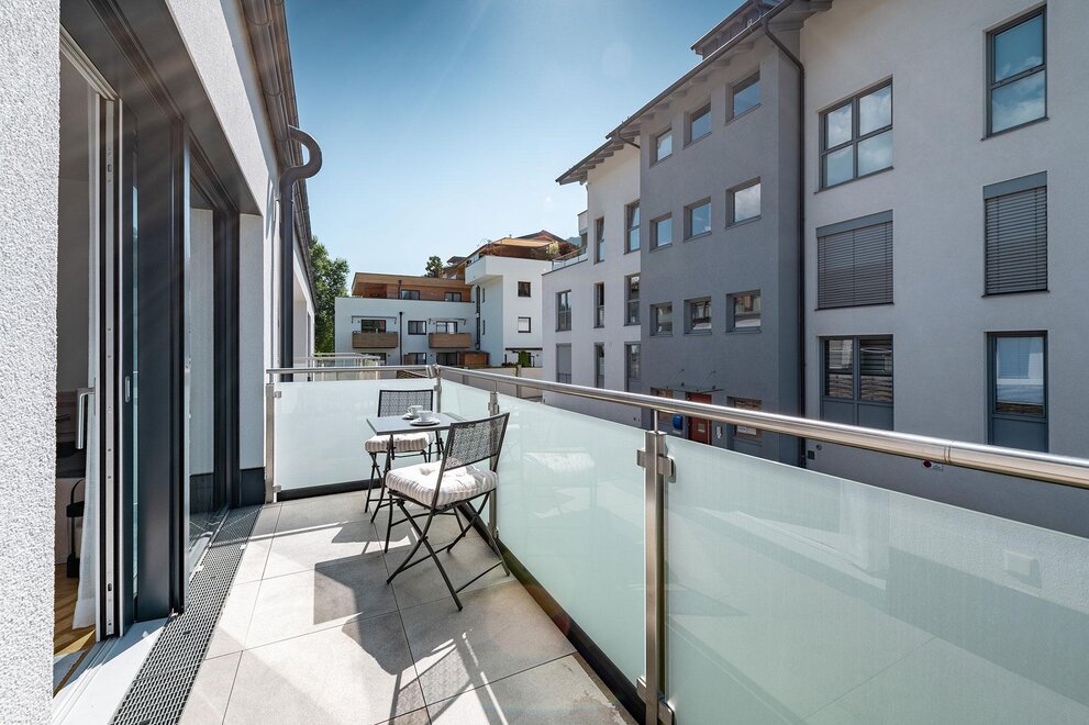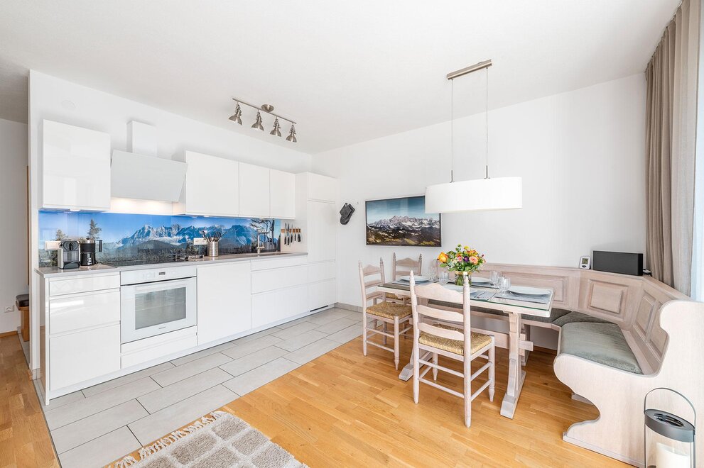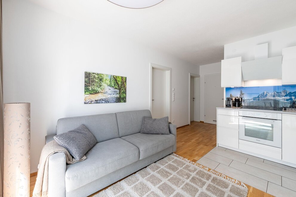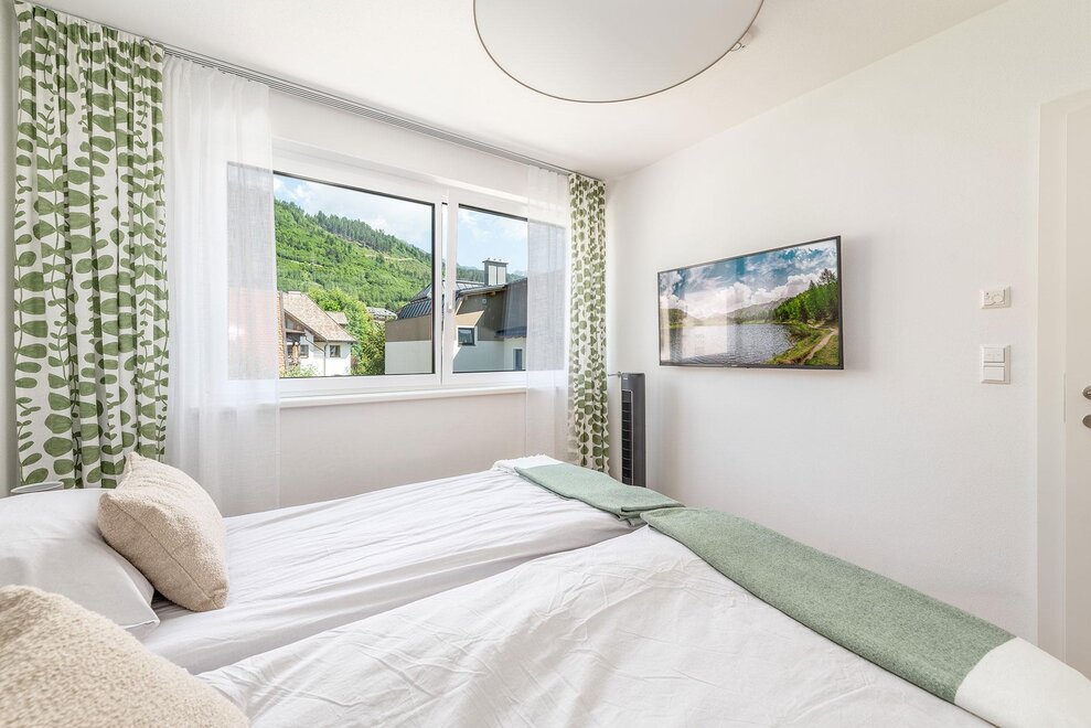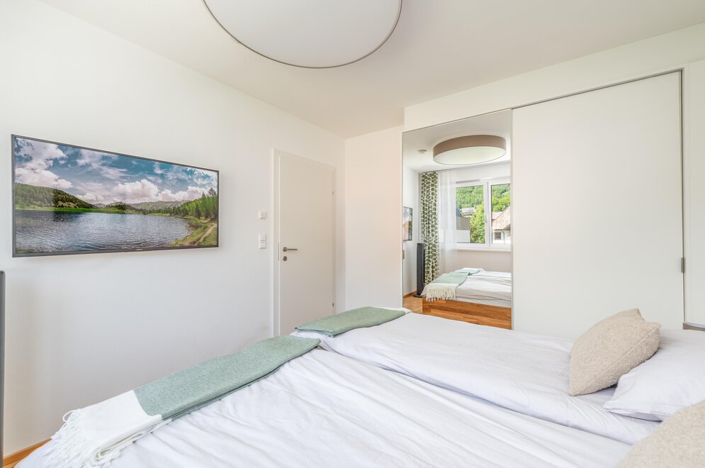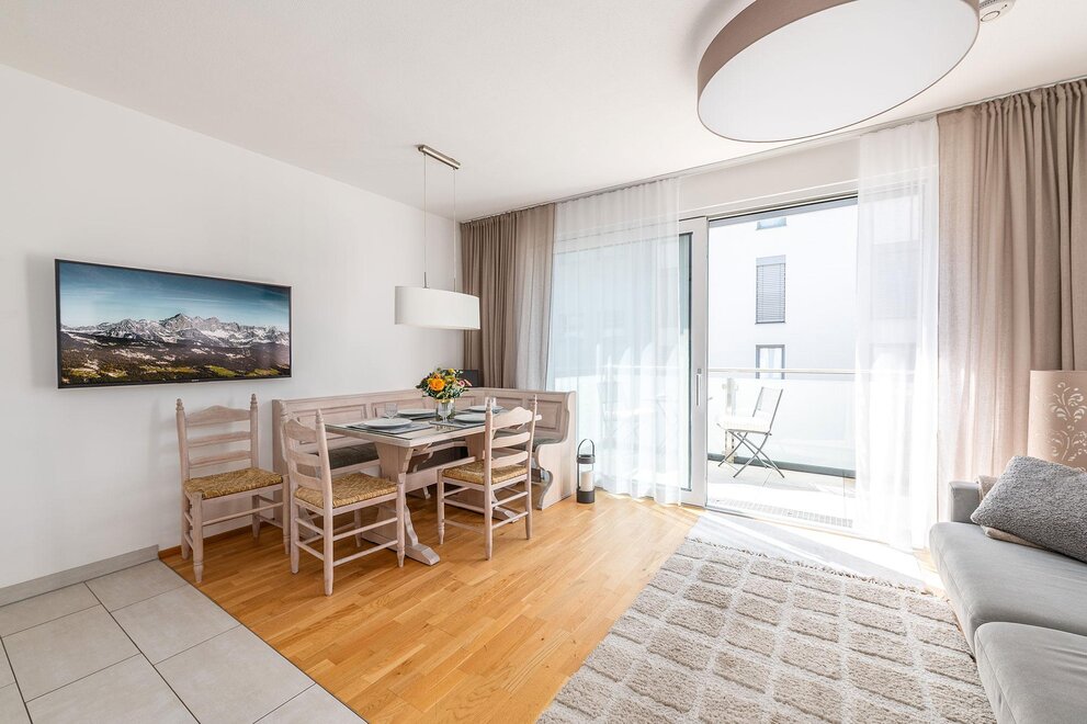 The tastefully furnished "Neualm 5" from myNests in the heart of Schladming offers space for up to 6 people. With its modern charm, the apartment provides a cozy, relaxing atmosphere with 2 bedrooms (double beds) and a sofa bed in the living area. You have a beautiful view of the mountains from the spacious terrace – perfect for mild summer nights. The apartment features two bedrooms with flat-screen TVs and a fully equipped kitchen with a dishwasher, oven, and coffee maker.