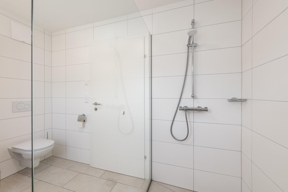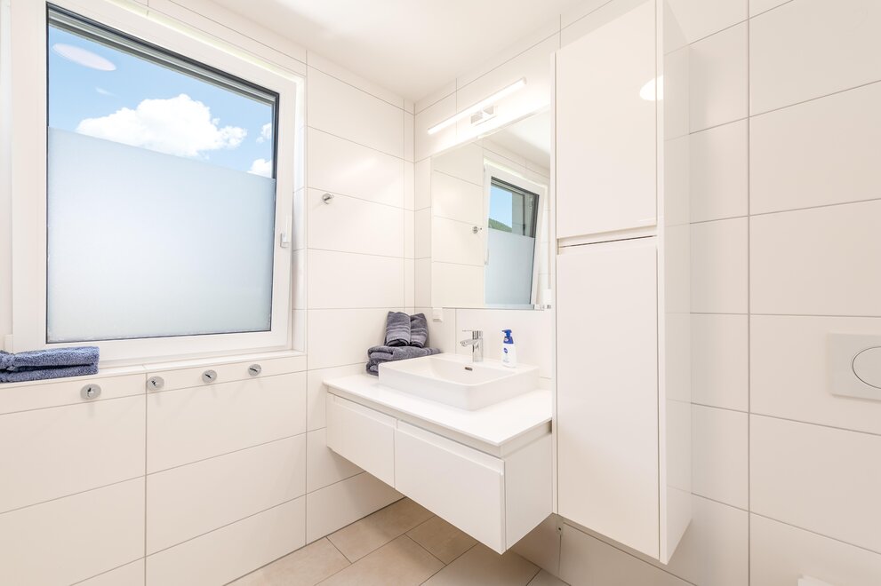 The bathroom is equipped with a generous shower and a sink. Towels and bed linen are provided.