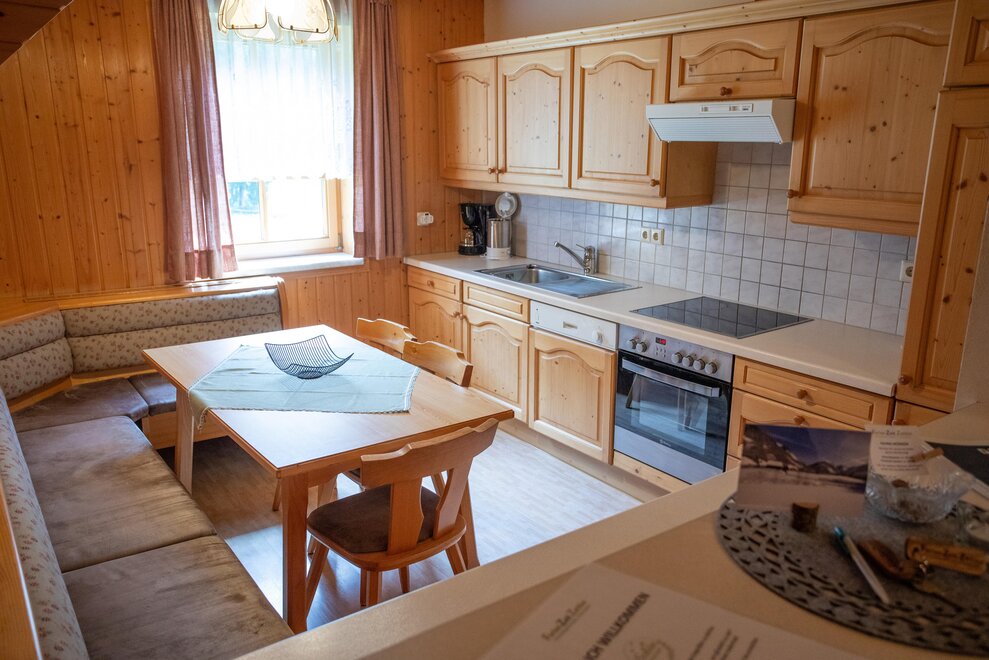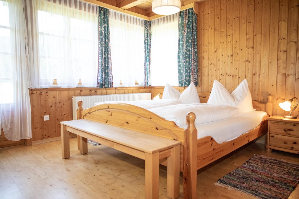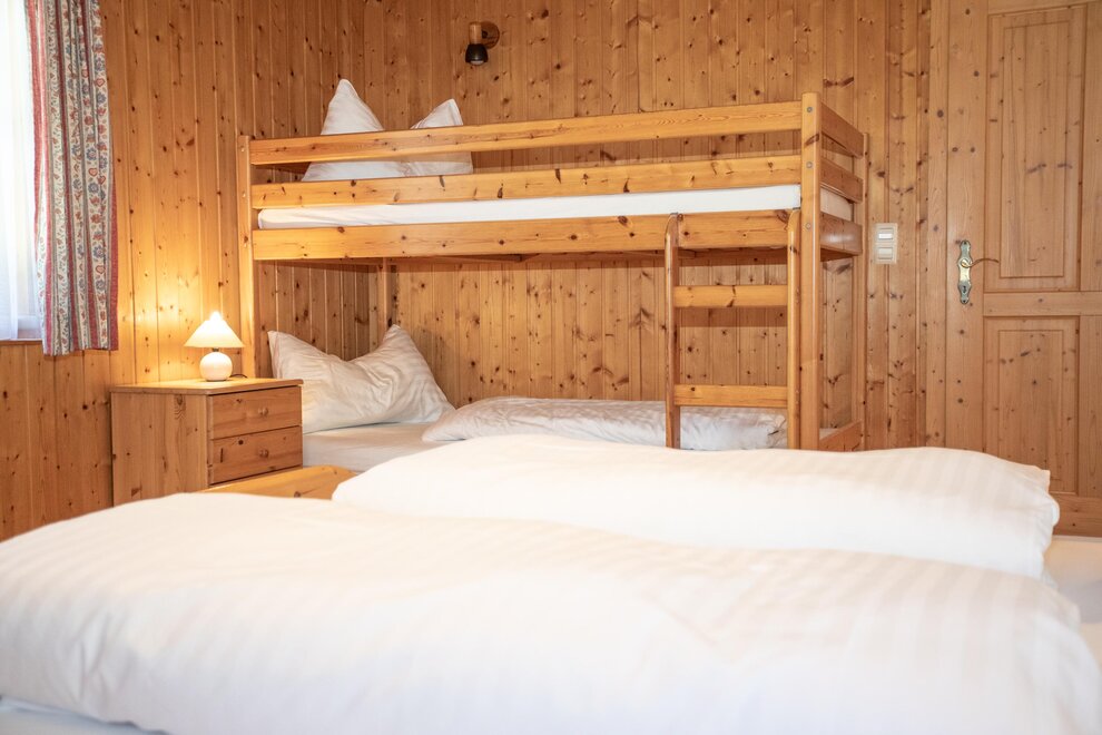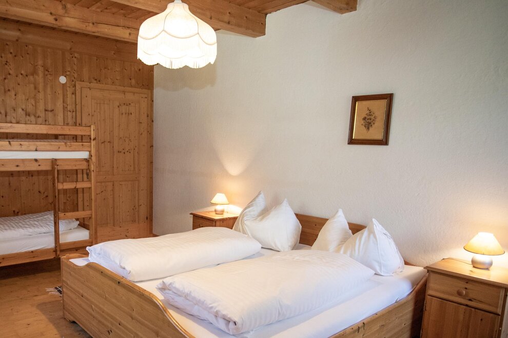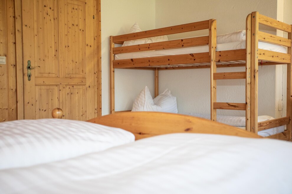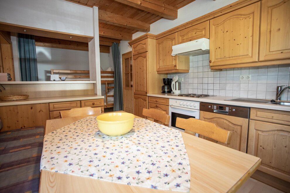 In our holiday home at Schaffergut, there are three holiday apartments in total. Each holiday apartment offers a space of 75 m² for up to 8 people: two bedrooms (with a sleeping niche featuring a bunk bed in the kitchen area), bathroom, and toilet, a fully equipped kitchen, and a balcony or terrace.