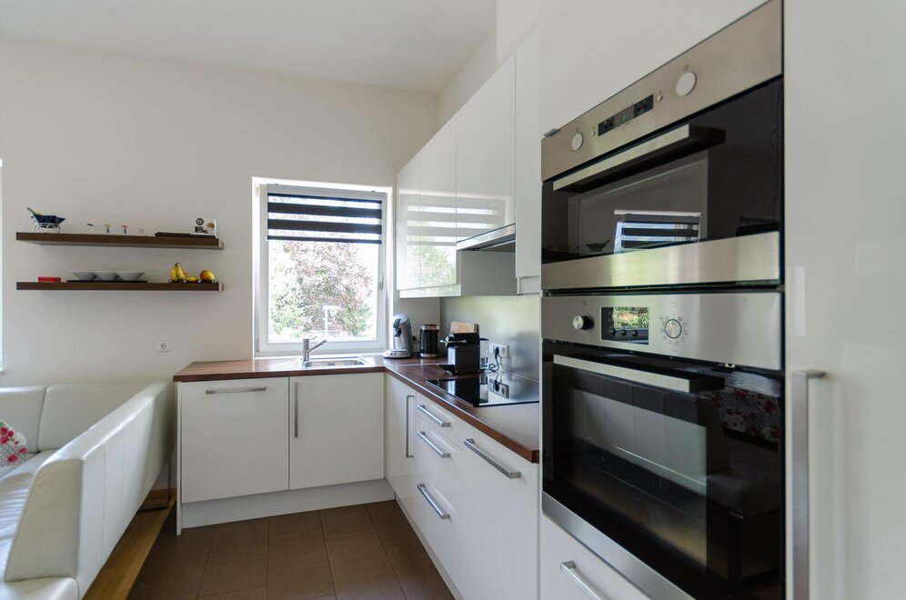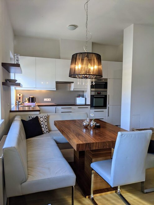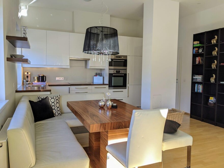 The apartment has a spacious living and dining room with sitting area. The modern kitchen is equipped with all conveniences such as an induction hob, an oven, and a separate microwave-combi oven, a dishwasher, a large fridge and a freezer with three drawers.