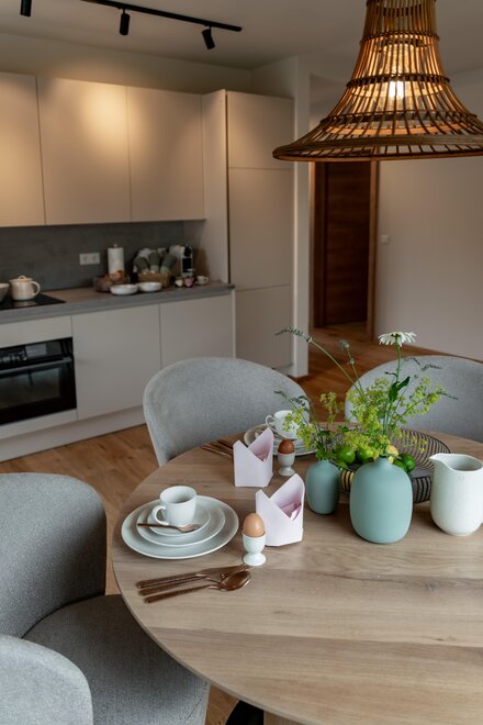 modern furnishing, refrigerators available, closet, cable TV, kitchen utensils, furniture suite, essentials (towels, bed linen, soap, toilet tissue), cooking possibilities, private entry, kitchen, bedding, high chair, internet connection available, refrigerator, bed linen available, terrace (some rooms), smoke detector, kettle, freezer compartment, wooden or parquet floor, oven, good as new room/apt., balcony, coffeemaker, TV, bed linen (non-allergenic), hairdryer, dining room, no carpet, dish sink, safe, vent hood, separate kitchen, room/apt. (non-allergic), dishes available, electric stove, balcony furniture, fire extinguisher, microwave, no pets allowed, dishwasher, towels available, anteroom, store room, non-smoking room/apt., balcony (in some rooms)