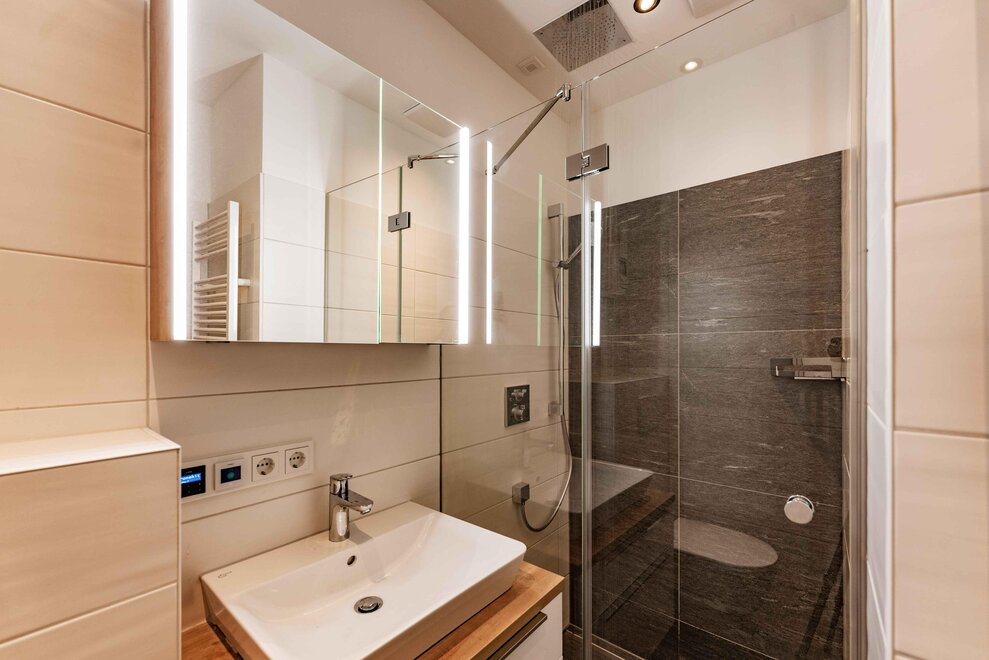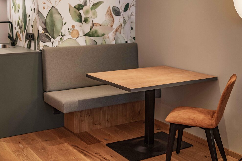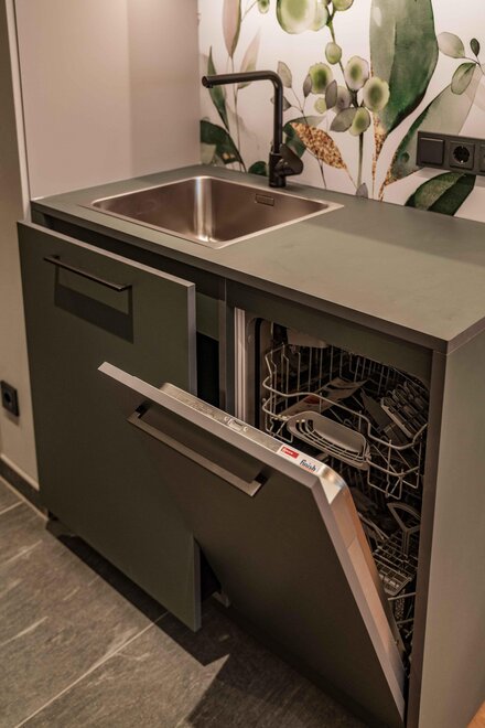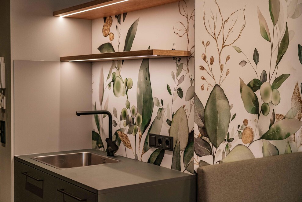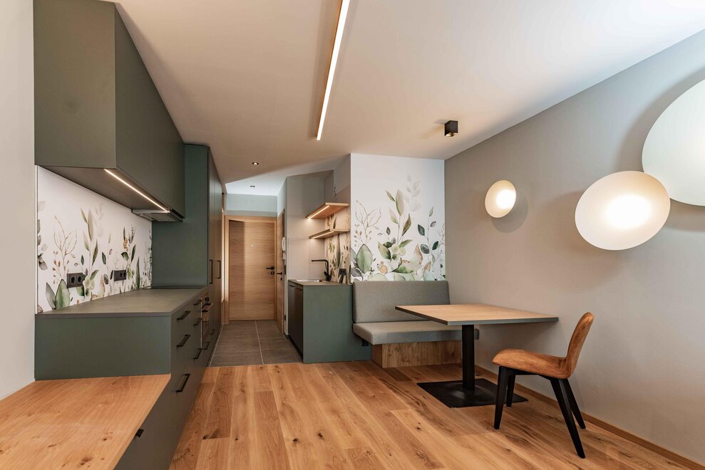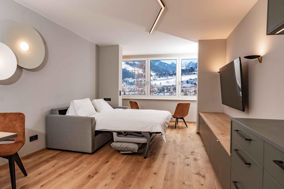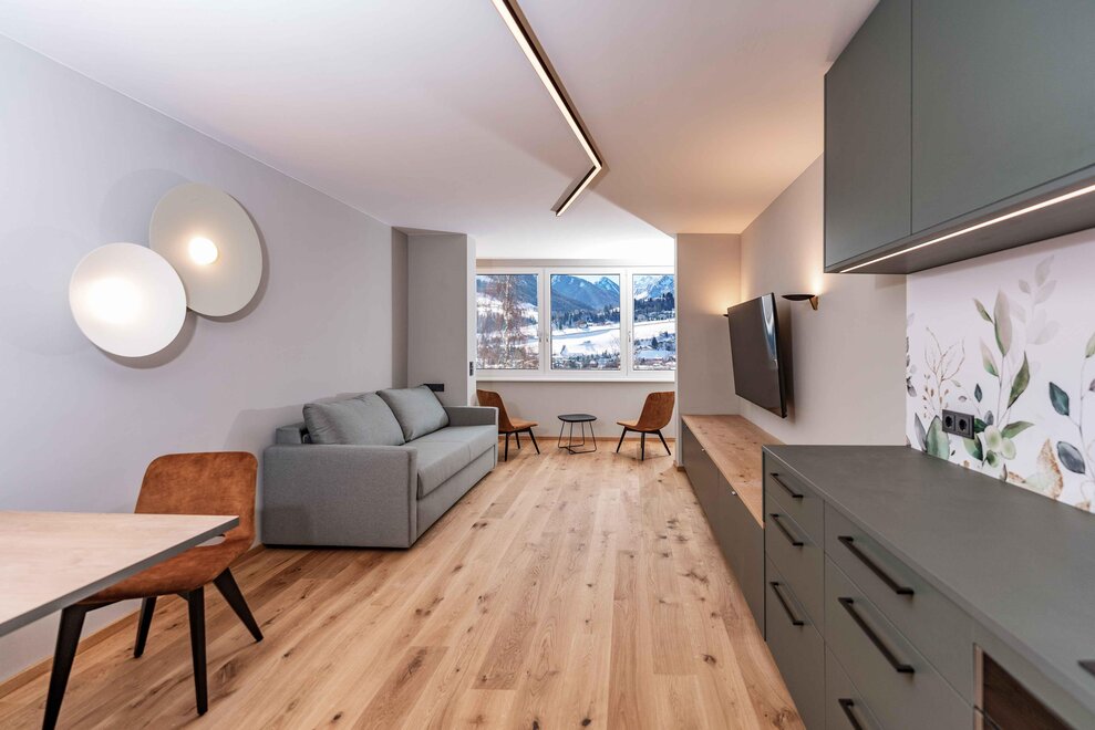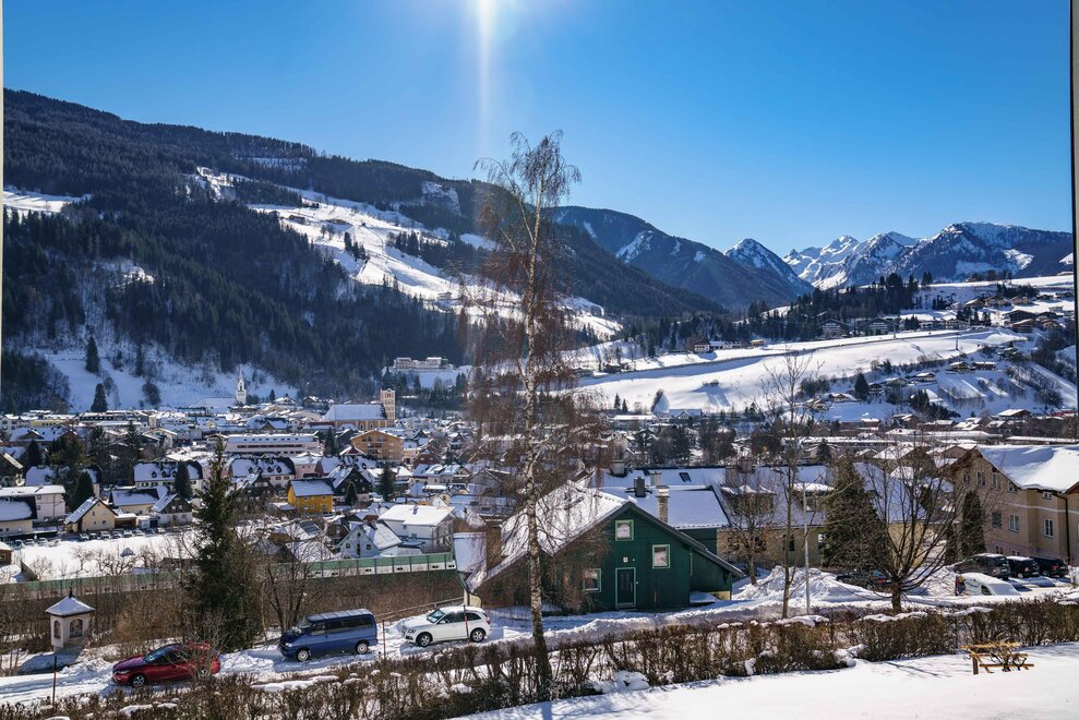 The stylish studio **UND BERG** on the sunny slope, offering panoramic views over the rooftops of Schladming as well as the Planai and the surrounding mountains, is high-quality and stylishly furnished. It features a fully equipped kitchen, Smart TV with Netflix, and electric blinds for convenient darkening. The south-facing location also delights with wonderful sunshine. A private parking space and a ski bus stop are right at the doorstep.
