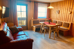 At the Unerzhuberhof, you stay in large holiday apartments with room for 2 to 4 persons. They have bright bedrooms and inviting bathrooms. Each has a fully equipped kitchen with a sitting room and a spacious sunny balcony, where you can enjoy lovely evenings. Furthermore, each holiday flat is equipped with a coffee maker, a fridge, electric kettle, and dishes. On request, we offer bread and bread rolls from the local organic bakery, and fresh organic produce such as eggs and milk from our own farm.