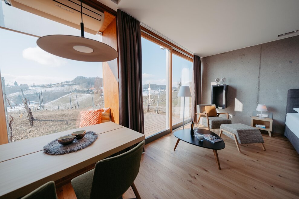 The apartment itself is spacious, bright, and very cozy. A highlight is the terrace that leads into nature and directly into the vineyards. The view is breathtaking in every season.