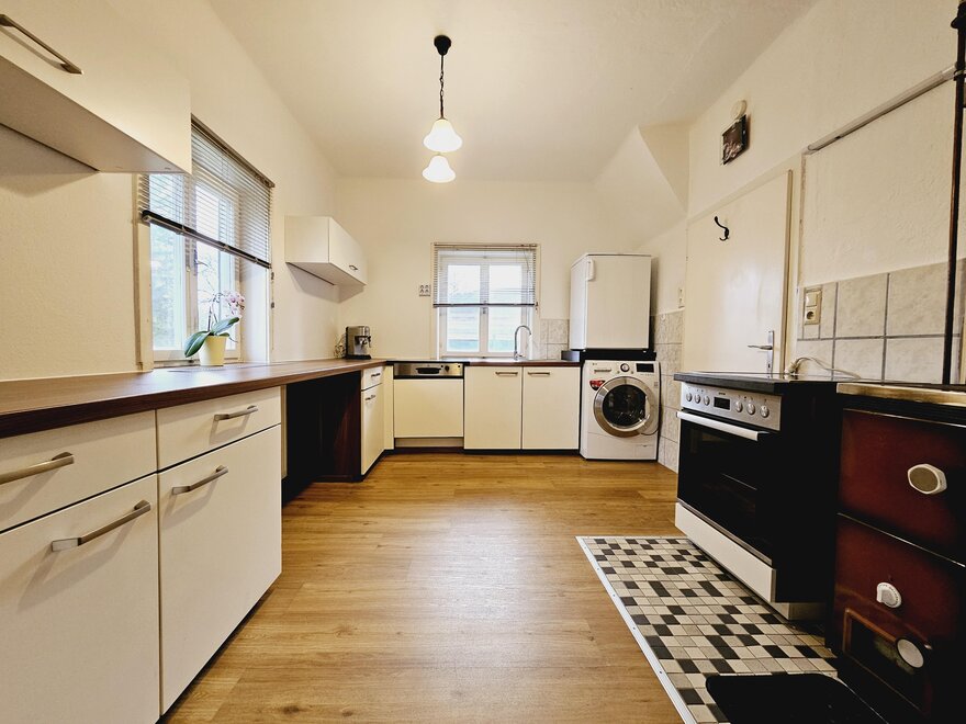 - Equipped kitchen including refrigerator with freezer compartment, dishwasher, electric stove, oven, coffee machine, kettle, dishes, washer-dryer, etc.