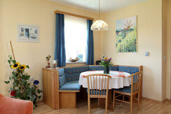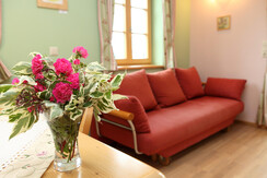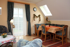 At ground level, barrier-free, the house offers a spacious eat-in kitchen with cooking island and all inventory, cozy living room with corner sofa, wing chair, LCD TV, .....so right to feel good. Enjoy the spacious south-west oriented terrace with views, far view that soothes, inspires and almost does not let go, large bedroom with covered balcony and view of the donkey pasture in the old orchard, bathroom with shower and toilet. On the upper floor there are two more bedrooms, one of them with double bed, covered balcony with west panorama and LCD TV. The second bedroom is flexible to use as a children's room or double bedroom, a comfortable double sofa bed provides additional space for 2 people if needed. The bathroom with shower and extra toilet make the house complete.