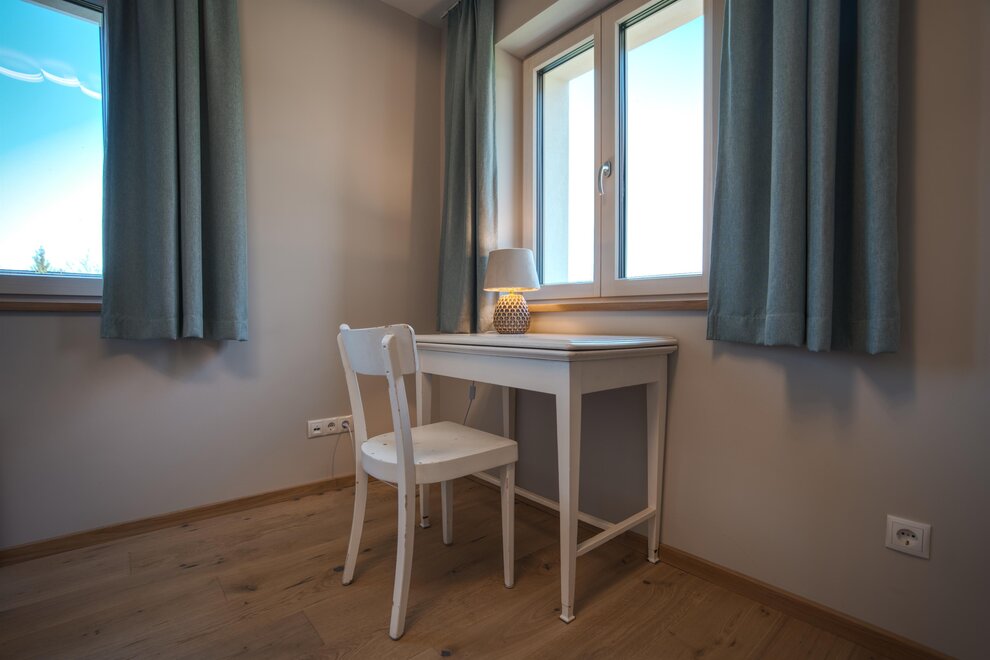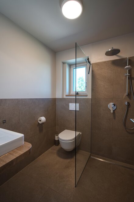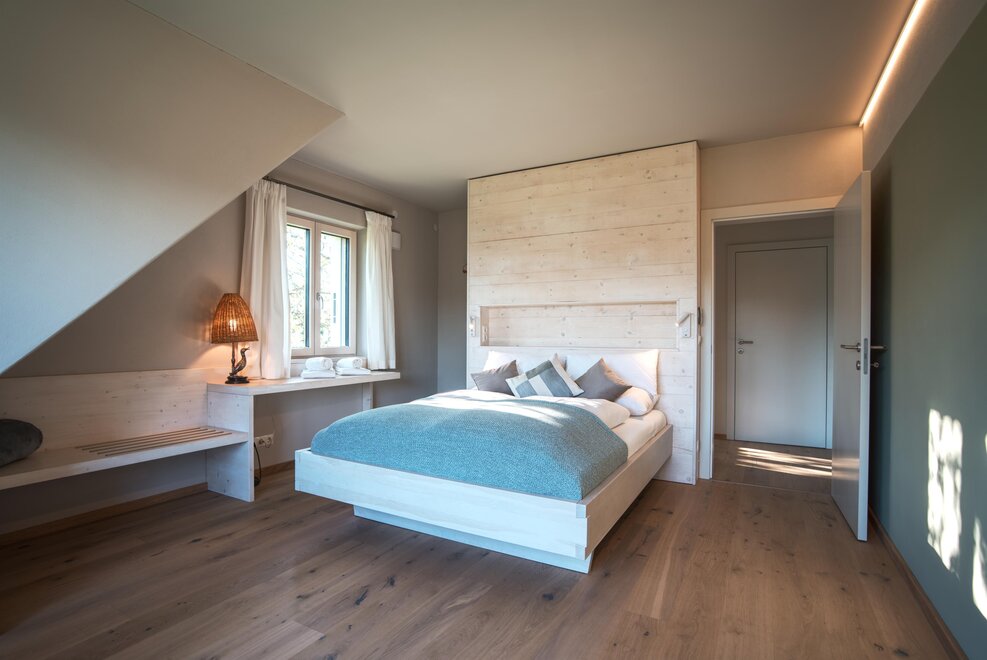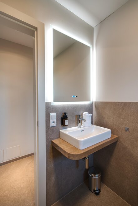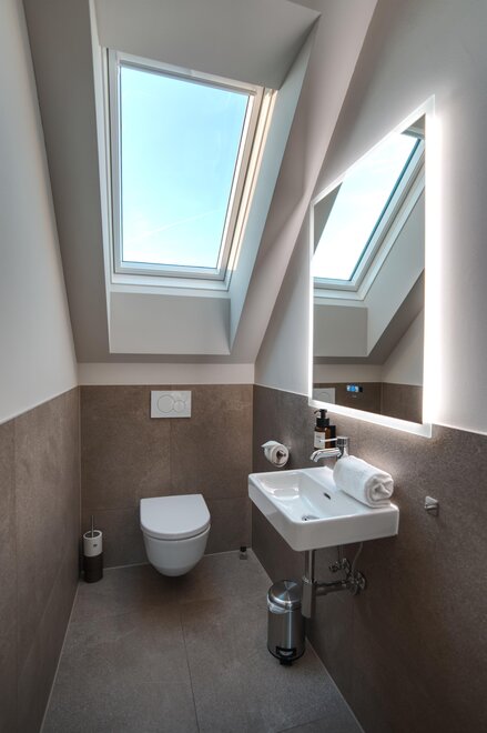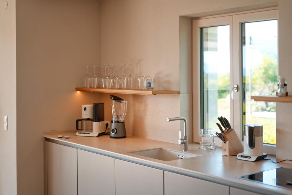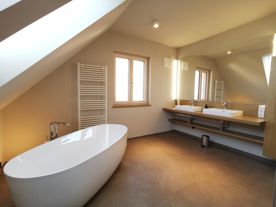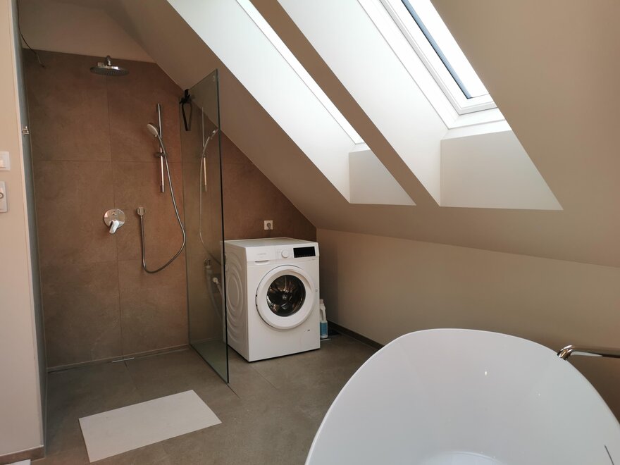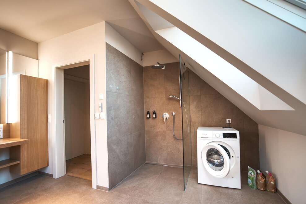 A fully equipped kitchen, 3 bedrooms with space for 5 people and a main bathroom with shower, free-standing bathtub, two washbasins and a washer-dryer await you. A separate WC is also located on the upper floor. In addition, there is a shower room with WC on the ground floor.
