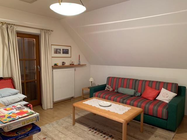 wooden or parquet floor, toaster, good as new room/apt., kitchen, vent hood, separate bedroom/s: 2, fire extinguisher, carpeted living room, garden, refrigerators available, luxurious furnishing, WiFi, bed linen available, oven, bedding, microwave, meadow, anteroom, bathrobe, separate bedroom/living room, CD player, tile stove, DVD player, private entry, open plan kitchen/living room, garden furniture, modern furnishing, kitchen utensils, dish sink, terrace, sauna, no pets allowed, carpeted bedroom, furniture suite, store room, separate living room, living room, socket close to bed, refrigerator, heater, kettle, stereo system, non-smoking room/apt., loggia, combination microwave, balcony, cooking possibilities, toiletries, essentials (towels, bed linen, soap, toilet tissue), closet, feather beds, dining room, desk, radio, TV, dishes available, towels available, kitchen and table linen, iron, combined bedroom/living room, internet connection available, quiet room/apartment, set for Raclette, electric stove, washing machine, set for Fondue, tiled or marmor floor, garden barbecue, smoke detector, balcony furniture, weekly cleaning, freezer compartment, central heating, satellite TV, hairdryer, dishwasher, video/DVD