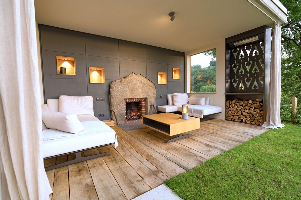 Also located in the basement, a newly equipped pool kitchen with fridge and ice maker. In the outdoor area, our guests can relax in the infinity pool, in the comfortable outdoor lounge with open fireplace, Spotify music system, heat radiators, and on the cozy outdoor sofas or sun loungers.