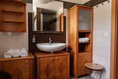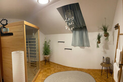 This apartment has a large living-dining area with a double sofa bed, balcony, and terrace. There is also a well-equipped kitchen in the apartment, two separate bedrooms with TV, as well as a bathroom/WC and an infrared sauna.