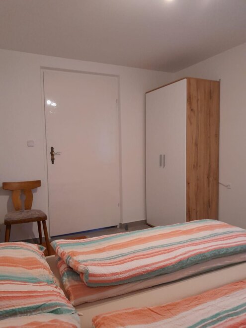 The cozy apartment on the first floor of the holiday home offers about 80 square meters of ample space for a relaxing stay amidst the vineyards. It features two bedrooms, a bright living room, a bathroom, and an inviting dining area.