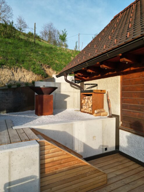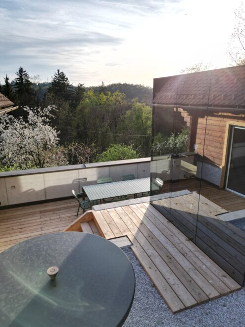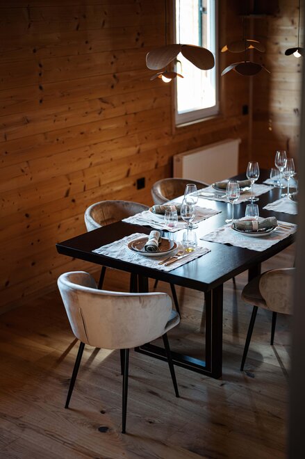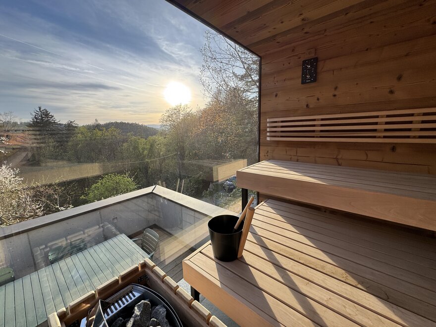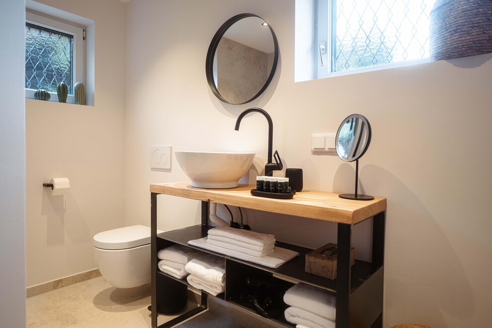 It is important to us to create the perfect conditions for a relaxing stay for our guests. Specifically, we have placed great value on high-quality and local selections in the interior design: all bedrooms feature box spring beds from the Upper Austrian manufacturer SEMBELLA, and the textiles are from LEITNER. The kitchen equipment is also of exceptionally high quality, for example, glassware has been sourced from RIEDEL. Last but not least, our approach is also reflected in the bathrooms: towels are from VOSSEN, and cosmetic miniatures are from RITUALS.