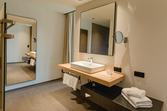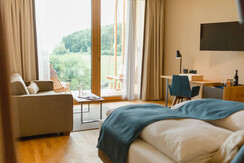 Whether it’s a jump into the year-round heated infinity pool with a breathtaking view or our natural pool that gently embraces the landscape and guarantees real "sea" value. Two saunas and an infrared cabin promise a deeply relaxing break from everyday life, while massage rooms and a well-fit water massage bed provide all possibilities to do something good for your body. Swing beds on the covered sauna terrace invite you to let body and soul dangle. On