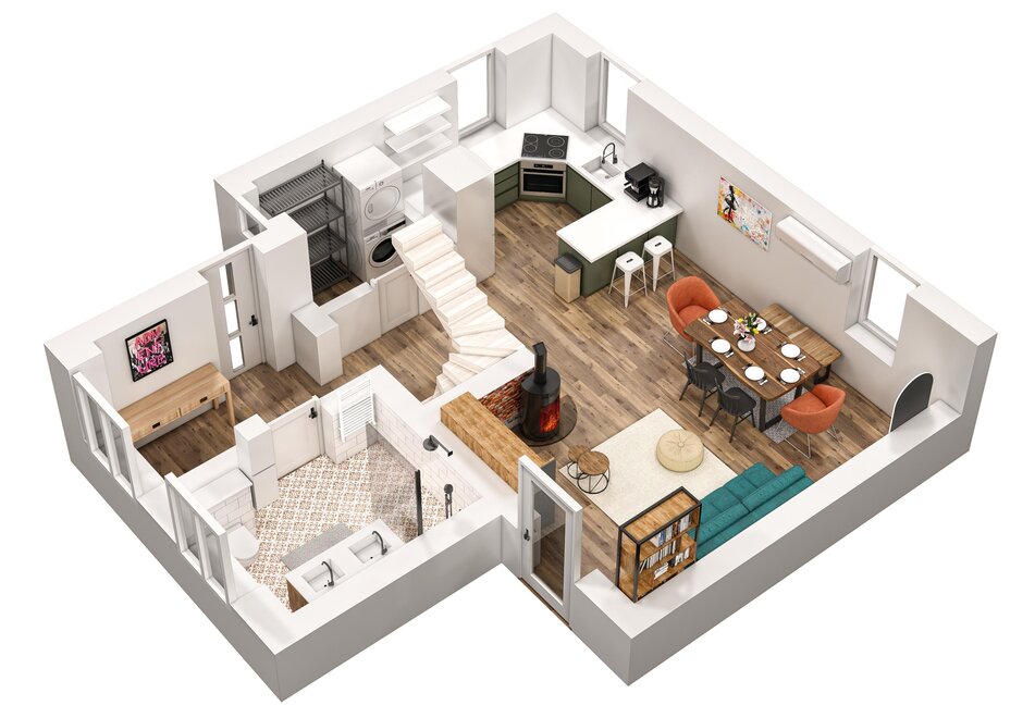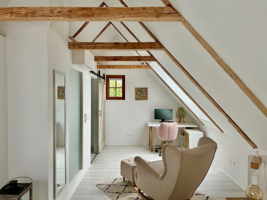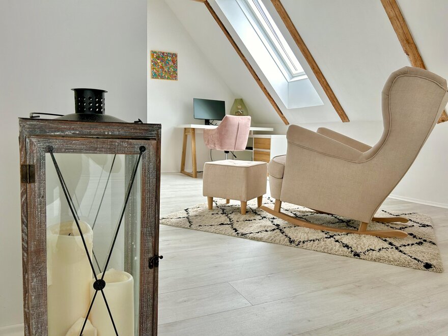 The house consists of an entrance hall, bathroom, kitchen-living room and an open sleeping area on the second floor with a very comfortable box spring bed (180x200), a rocking chair and two work options.