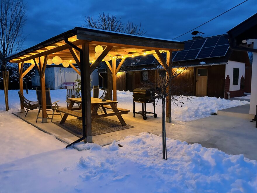 The outdoor area with large gazebo (5.5x3.5m) fireplace, lounge, sitting area and barbecue invites you to linger & enjoy