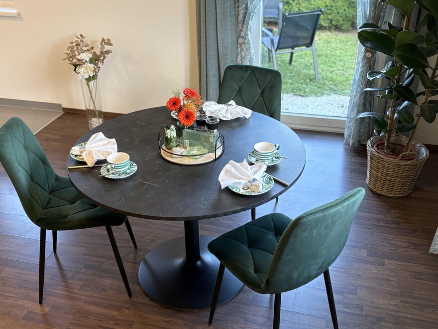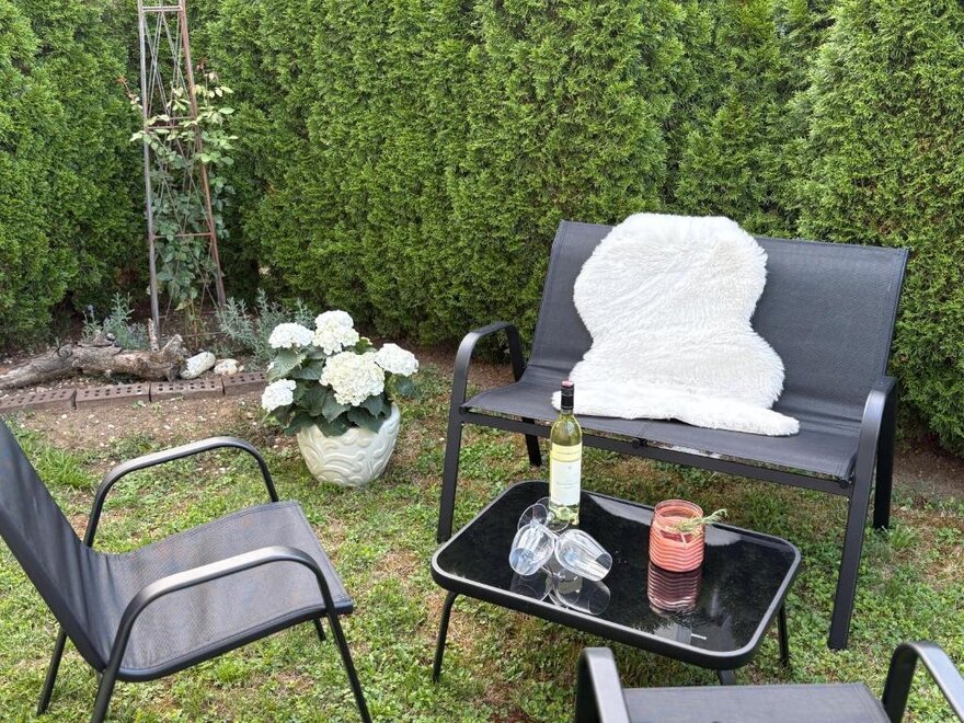 Through the terrace door, you can comfortably access your own small private garden, where you can unwind after an eventful day with a glass of South Styrian wine, relaxing on the garden lounge.