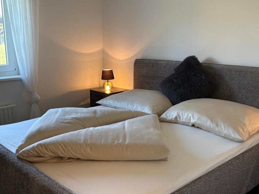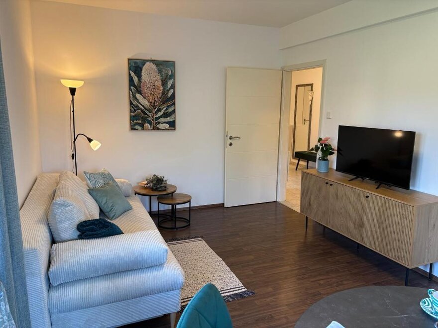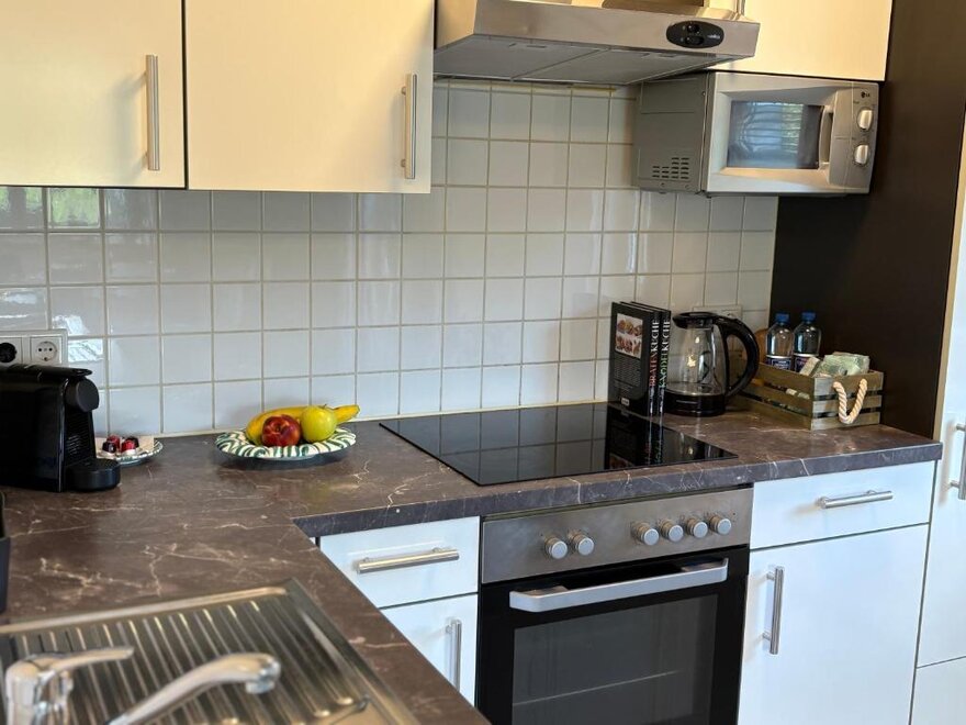 The lovingly furnished 52 m2 holiday apartment "Juli" consists of a spacious entrance area, a cozy living and dining area, a comfortable bedroom, a modern bathroom with shower and toilet, and a fully equipped kitchen with ceramic cooktop, oven, microwave, coffee machine, and a refrigerator with freezer compartment.