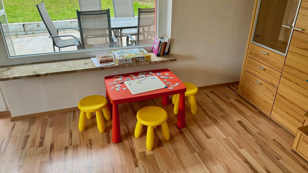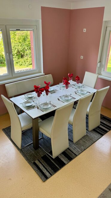 dining room, smoke detector, garden furniture, socket close to bed, pets permitted on request, heater, separate bedroom/living room, meadow, modern furnishing, kitchen and table linen, closet, kitchen, bedding, kettle, satellite TV, non-smoking room/apt., carpeted living room, terrace (some rooms), stair gate, radio, quiet room/apartment, use of washmachine, bed linen (non-allergenic), washing machine, garden barbecue, dish sink, separate living room, electric stove, cooking possibilities, bed linen available, dishwasher, toaster, kitchen utensils, freezer compartment, furniture suite, separate bedroom/s: 0, open foot-end of bed, hairdryer, maximum no. of pets: 2, anteroom, iron, good as new room/apt., TV, living room, private entry, towels available, coffeemaker, baby change pad, fire extinguisher, oven, central heating, weekly cleaning, essentials (towels, bed linen, soap, toilet tissue), WiFi, high chair, store room, desk, refrigerators available, terrace, dishes available, garden, wooden or parquet floor, tiled or marmor floor, refrigerator, toiletries, vent hood