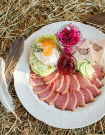 A Brettljause for friends of Styrian hospitality, light fare with a regional touch or vegetable variations for vegetarian gourmets - our kitchen has fine things to offer for every taste. The ingredients come fresh from our garden or from producers from the surrounding area, with whom we have a long-standing cooperation. Probably some reasons, why our house may carry the predicate "Excellent Buschenschank". Where you enjoy all these delicacies is up to you: in the cozy guest rooms, which can accommodate 70 guests, or on the terrace with a view of the vineyards. In a small circle or with a large group, for which we come up with special ideas. In any case, we season with love - and you can taste it! Tip: Have you already tried our tasting menu? Fresh seasonal ingredients in a 4- or 6-course menu with wine accompaniment. An experience for gourmets!
