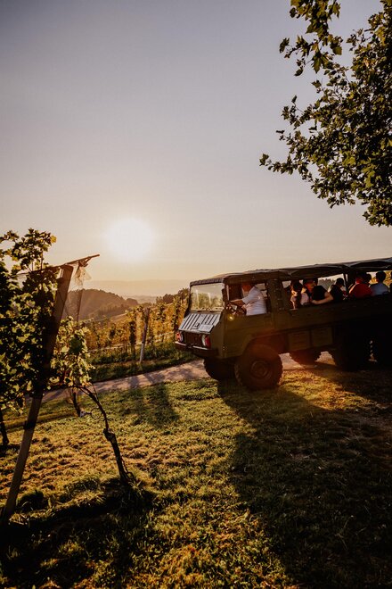 Experience an extraordinary adventure in the midst of the vineyards! With our original Pinzgauer off-road vehicle (space for up to 8 people), we will take you on a guided tour through the picturesque vineyards – a unique experience for groups, families, or friends.