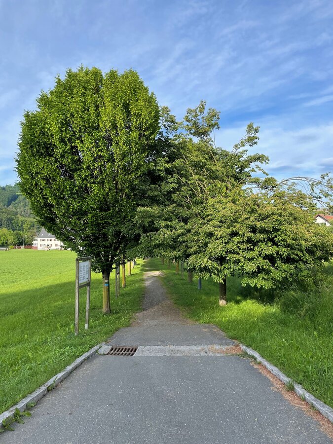 Der Weg führt über befestigte Straßen, über Wiesen und einen Weingartenweg.