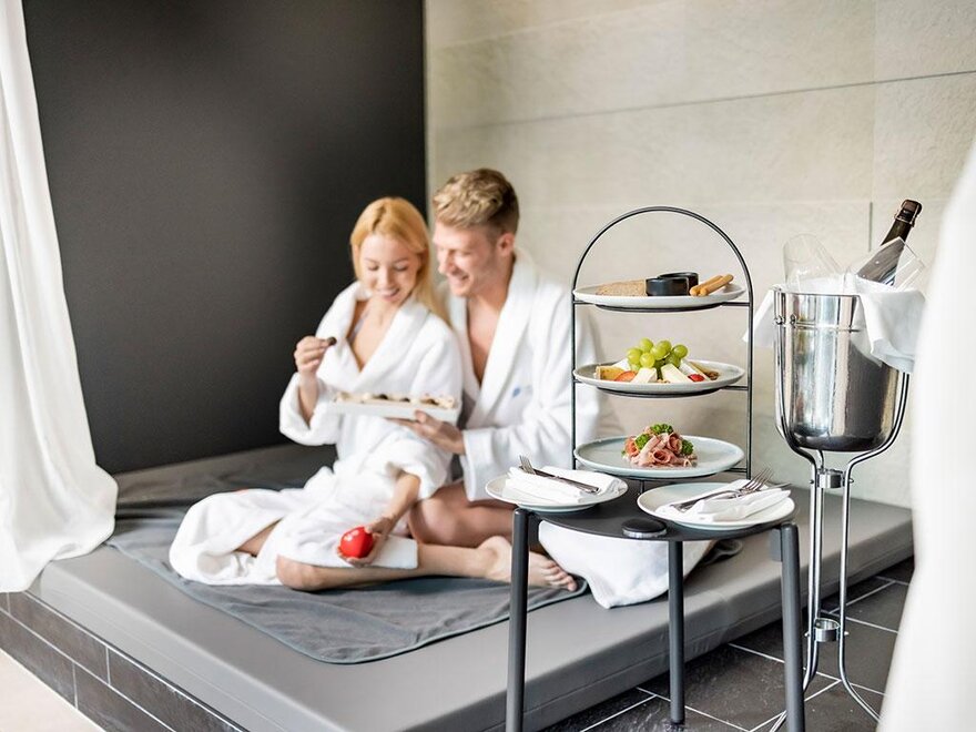 • 1 x Reservierte Kuschelliege mit Kuscheldecke, 1 x Frizzante & Pralinen, Mineralwasser und Überraschung, 1 x Kulinarik-Teller mit süßen & pikanten Spezialitäten an der Liege, 1 x Butlerservice an der Liege