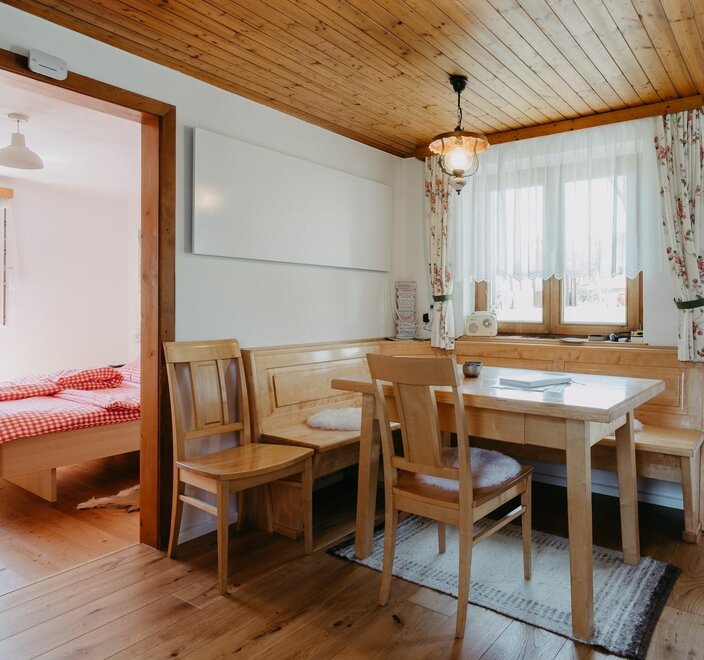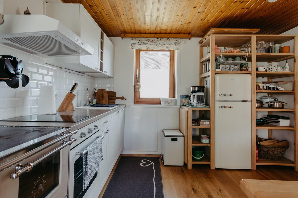 In the spacious living-dining area, a fully equipped kitchen offers every comfort, and infrared panels and a romantic kitchen stove provide cozy warmth even in winter.