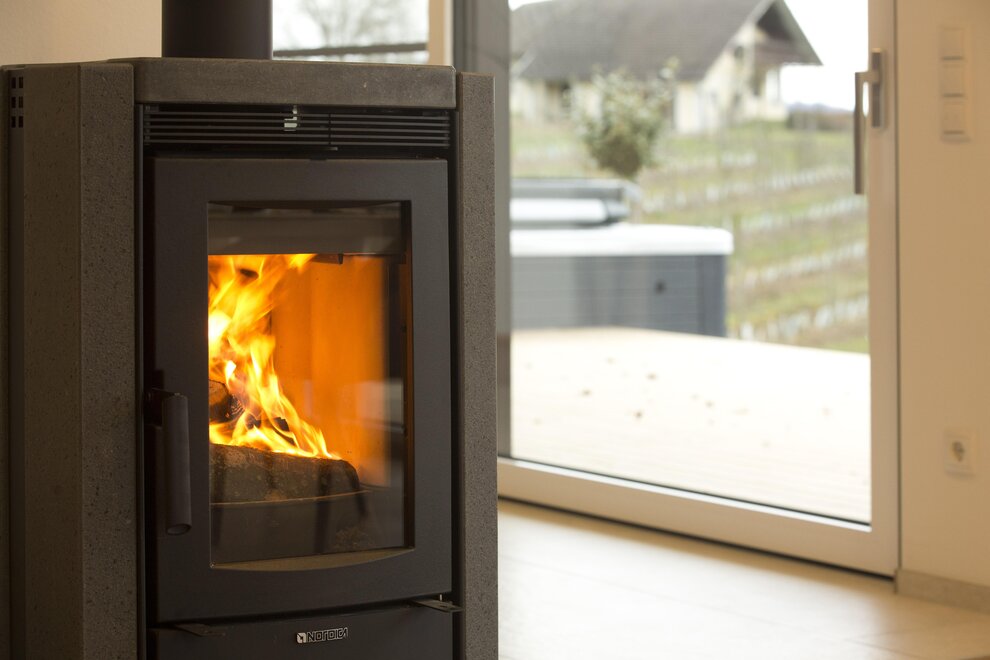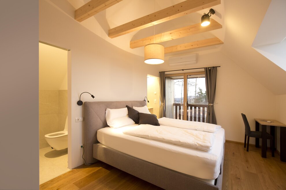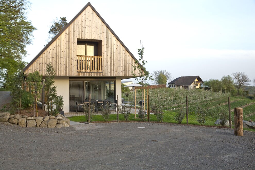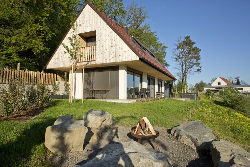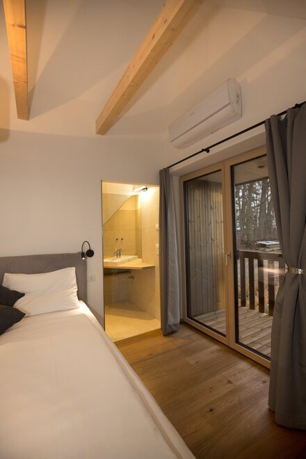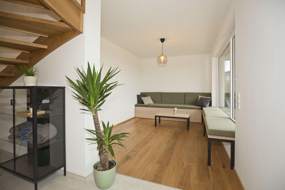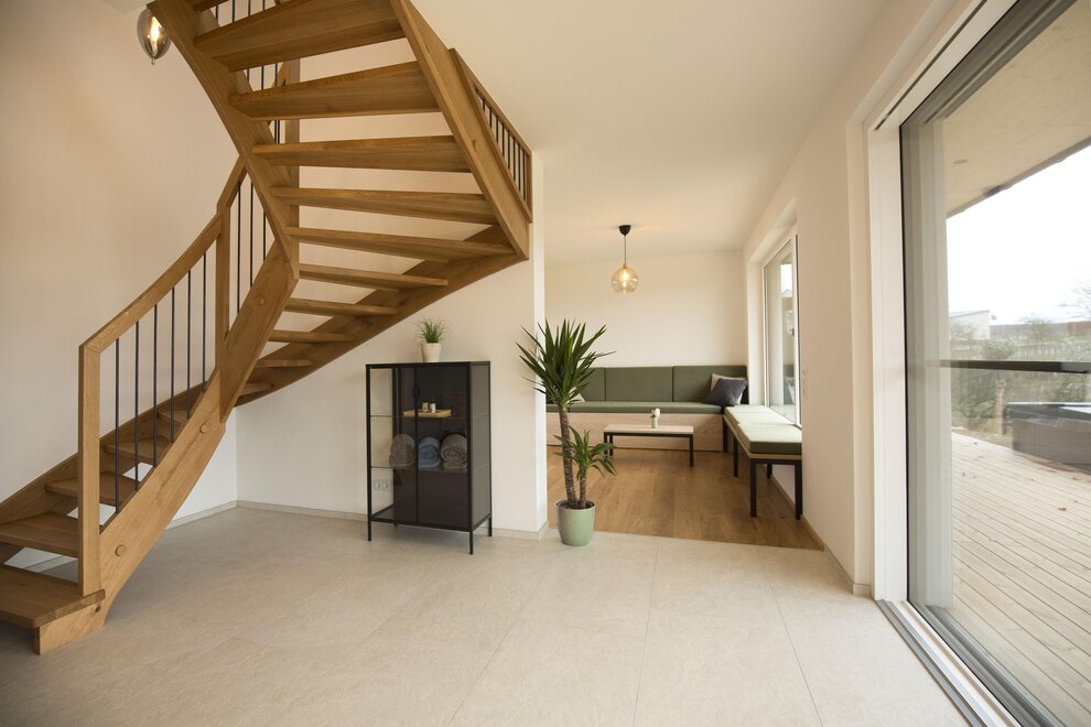 The generous ground floor, designed to be partially barrier-free, impresses with a fully equipped carpenter's kitchen and a cozy living area with a sofa bed. Large glass fronts allow for an unobstructed view of nature and create a bright, open atmosphere. The interior made of local oak, complemented by elegant black steel accents, gives the room a warm and inviting touch.