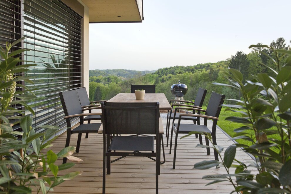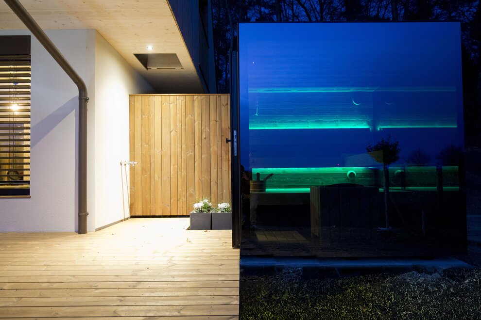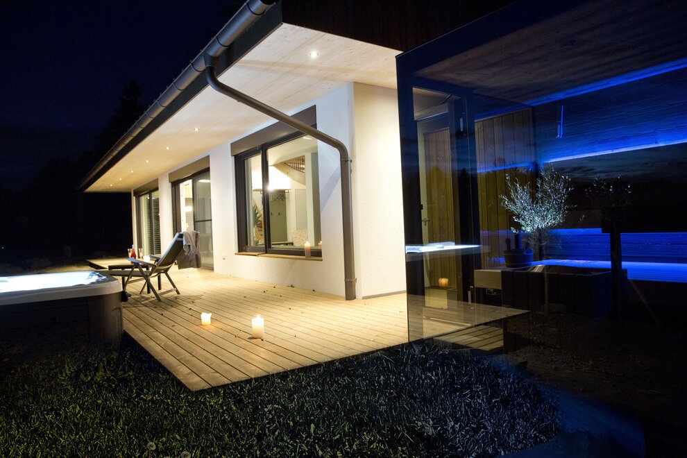On the wooden terrace, you can enjoy the sun all day long, relax in the private hot tub, or unwind in the stylish mirror sauna in the evening.