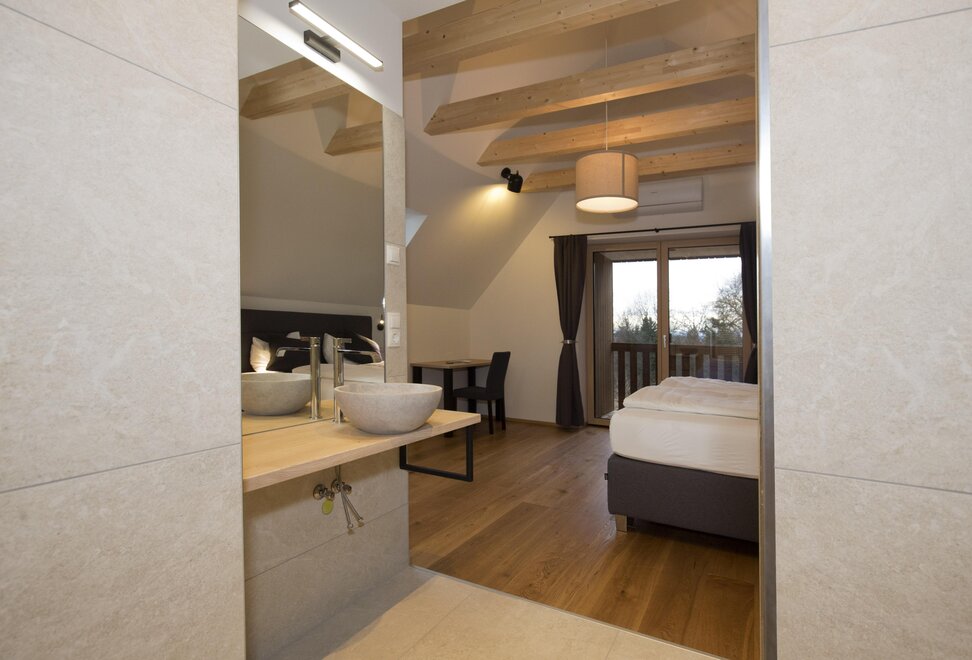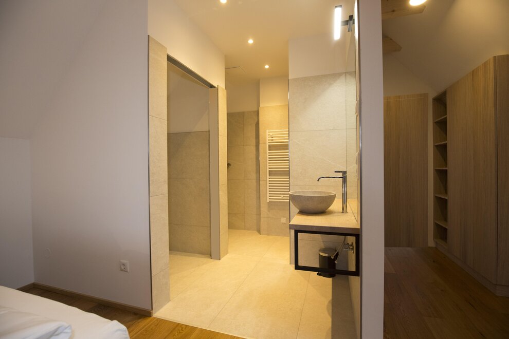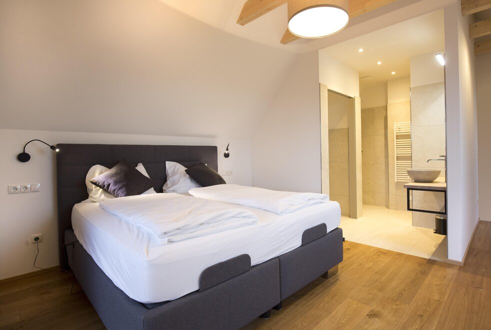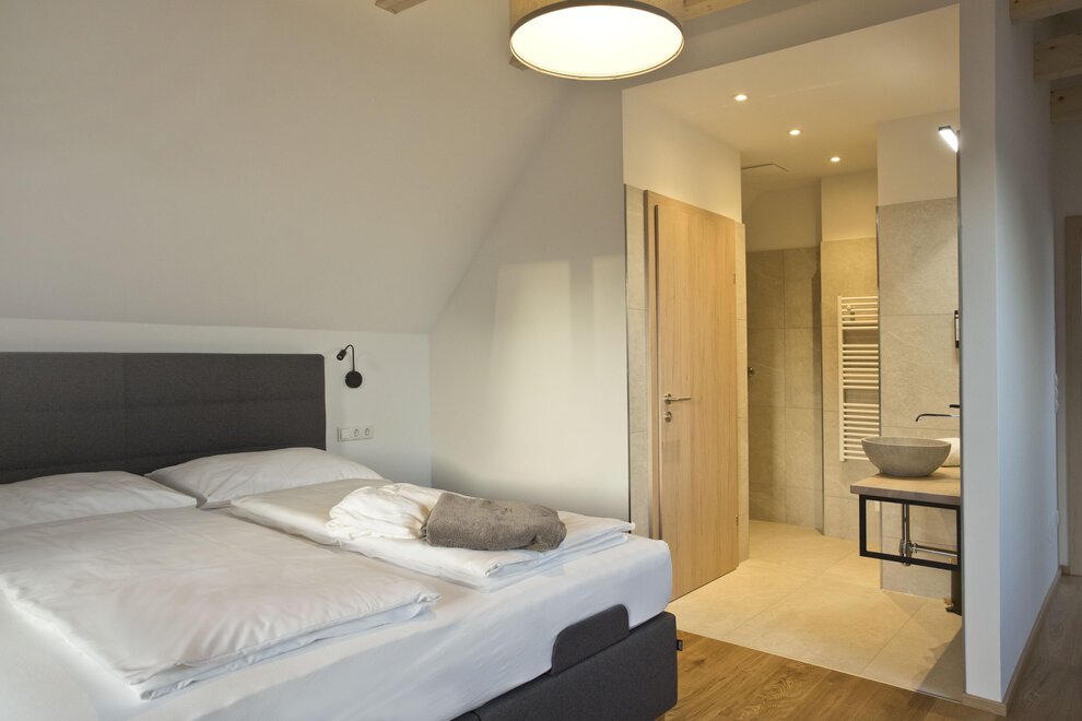 On the upper floor, two separate sleeping suites await you, each featuring comfortable box spring beds as well as its own shower and toilet area for the utmost living comfort.