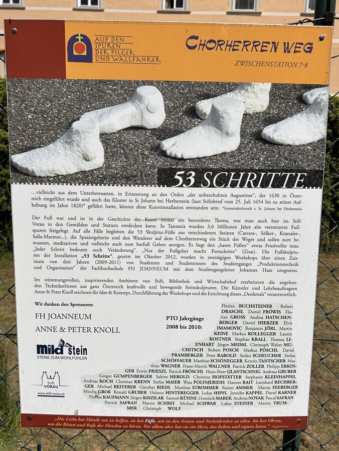Zwölf Stationen sollen einen Blick hinter die Mauern des Augustiner-Chorherrenstiftes Vorau ermöglichen, die Geschichte, das Leben und den Auftrag seiner Bewohner, der Augustiner Chorherren, näherbringen und einladen, den Weg auch innerhalb der Stiftsmauern fortzusetzen.