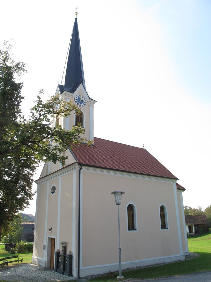 Wir starten direkt beim Bildstock in der Mitte von Schwarzmannshofen und gehen über eine kleine Brücke in den Wald. Ein kurzes Stück steigt es nun an. Bei einer kleinen Siedlung kommen wir vorbei und folgen der Straße in den Ort Loimeth. Bei der Kreuzung ein kurzes Stück nach rechts und dann links Richtung Jobst abbiegen. Hier kommen wir beim kleinen Teich in Loimeth vorbei. Ein Picknickplatz unter einer Linde lädt zum Rasten ein.