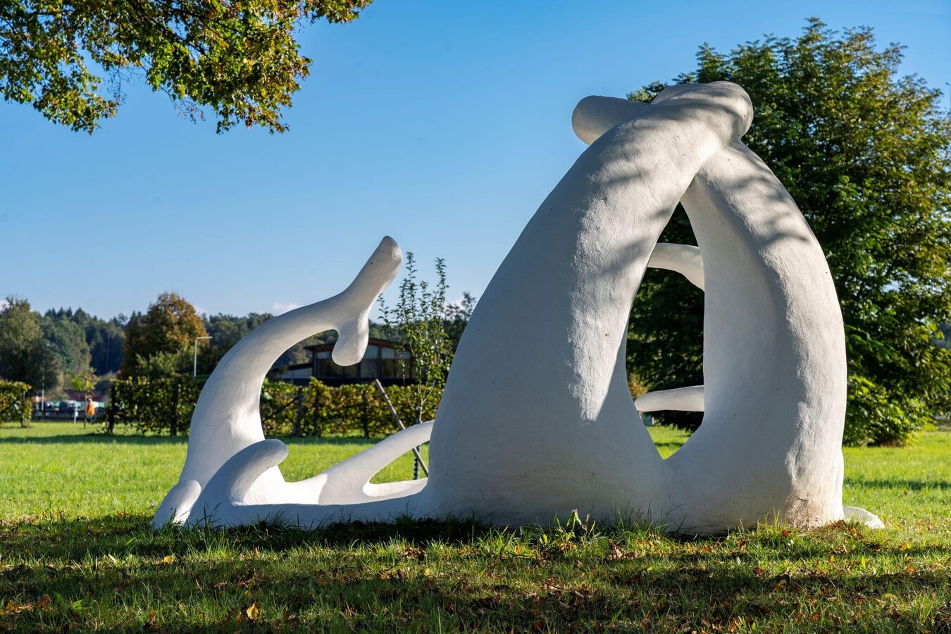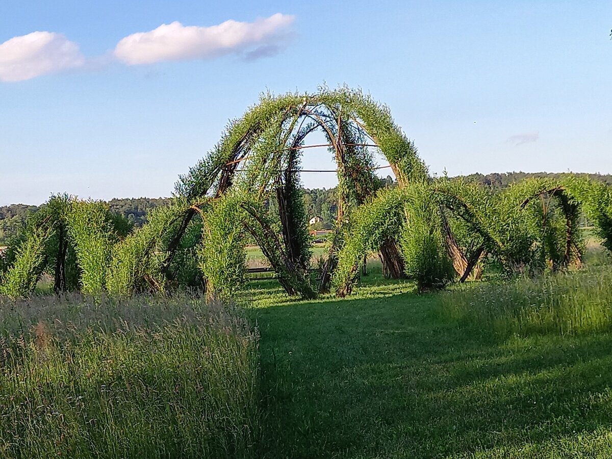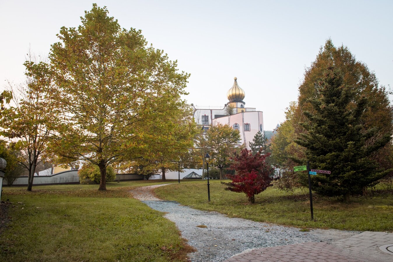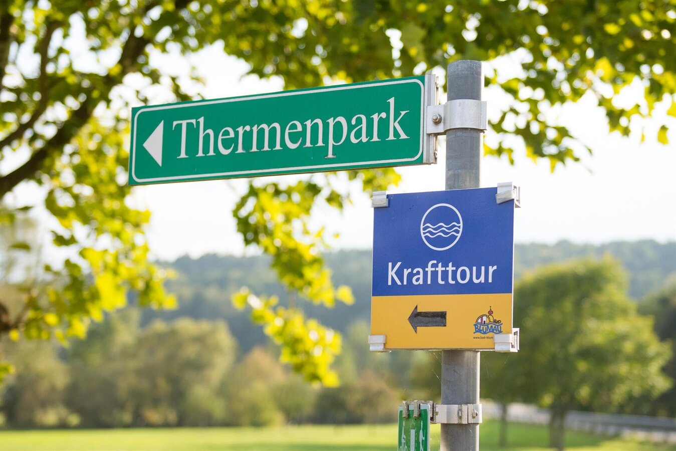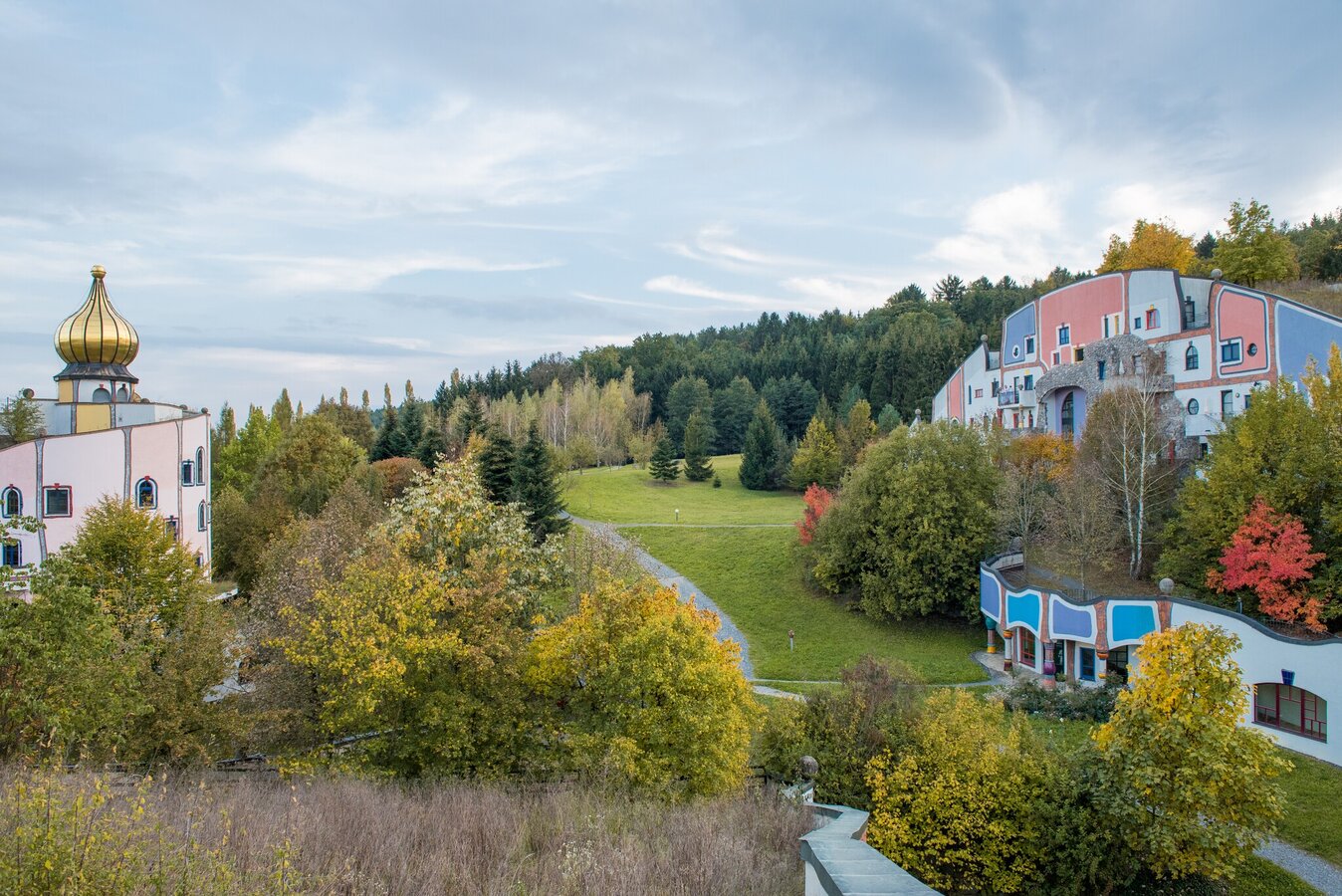Bad Blumau at the herb garden, you cross a wooden bridge into the Bad Blumau thermal spa park. Here you start the power tour in a clockwise direction. Pass the dovecote, biotope and the "Wasserstelle" art installation and head towards the Rogner Bad Blumau thermal baths. From the entrance to the thermal baths, follow the Safenbach towards Schwarzmannshofen. Turn right at the geomantic stone and cross a road. Then turn right into the village of Kleinsteinbach.